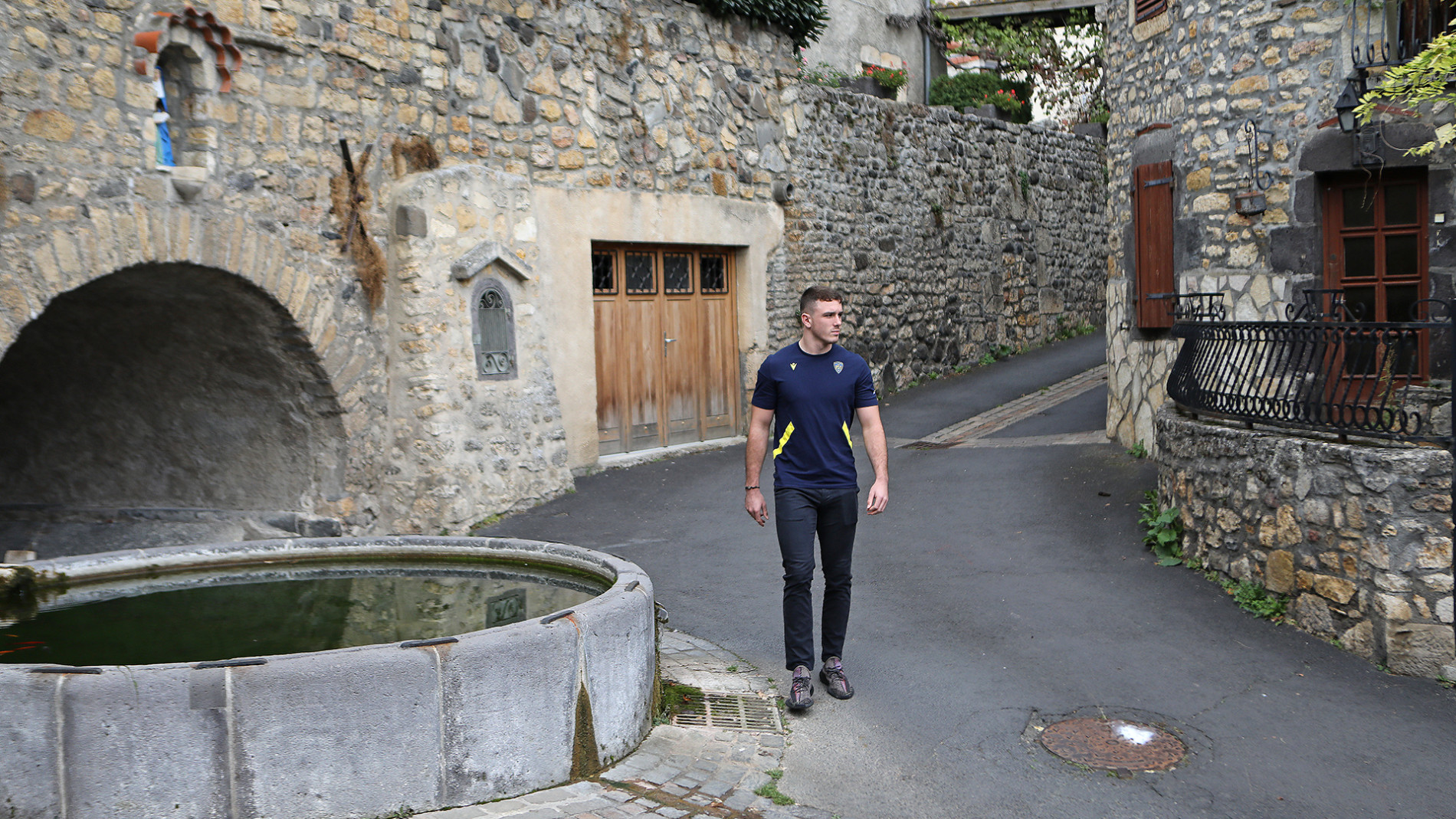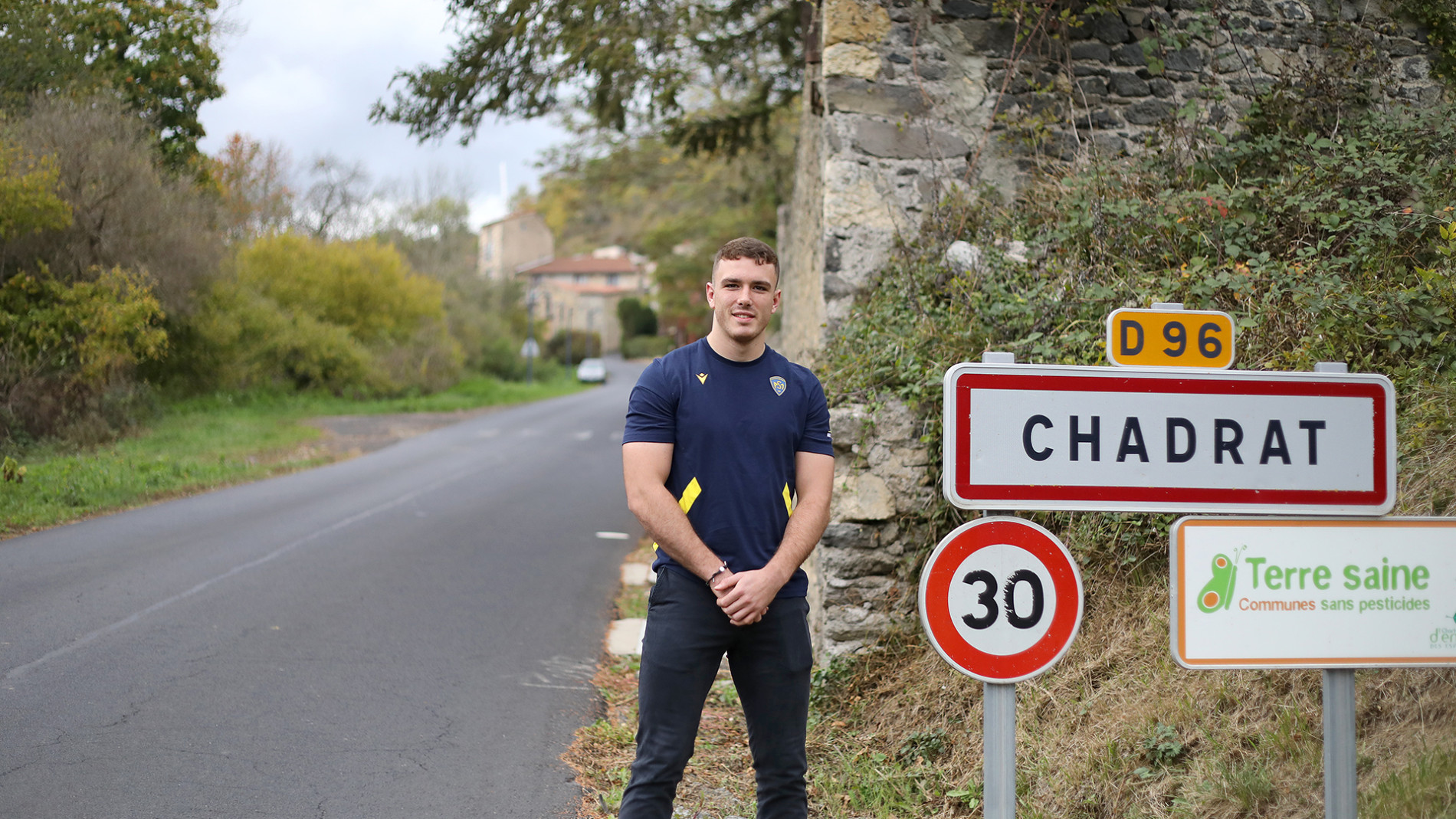Une ou deux centaines d’habitants, guère plus, habitent aujourd’hui le petit village de Chadrat posé dans une côte que les cyclotouristes du coin connaissent bien pour les pourcentages rudes qui traversent le village aux sept fontaines. Parmi eux, la famille Tixeront. C’est là, au pied de la montagne de la Serre, un haut lieu d’observation des oiseaux migrateurs située à mille mètres d’altitude, que Killian a grandi. Dans cet ancien hameau vigneron aux façades rénovées à la pierre ocrée et aux tuiles corail, tout lui est familier comme ce chemin en direction de la croix de la Boria où il nous emmène. « De là, tu as une vue sur toute la vallée et même sur le Sancy à l’horizon. J’adore ce village, il fait partie de moi. » La table d’orientation porte notre regard en direction de Saint Saturnin, en contrebas, … un peu plus haut : St Sandoux. Le village de la montagne d’en face qui n’est qu’à un battement d’aile que semble rejoindre un rapace qui nous survole dans le ciel automnal. C’est là que Killian a fait connaissance avec la balle ovale grâce à sa grand-mère Jocelyne. « C’est une vraie fan de l’ASM et de Rugby en général. Elle regarde tous les matches. C’est en voyant les émotions qu’elle pouvait vivre à travers la TV que j’ai eu envie de voir, en vrai, ce que cela pouvait donner sur le terrain. » Direction les Martres de Veyre, quelques kilomètres plus bas dans la vallée. Dès les moins de 9 ans, il accroche pour le jeu mais aussi et surtout « pour les potes, les déplacements, les rigolades… le plaisir quoi ! »
