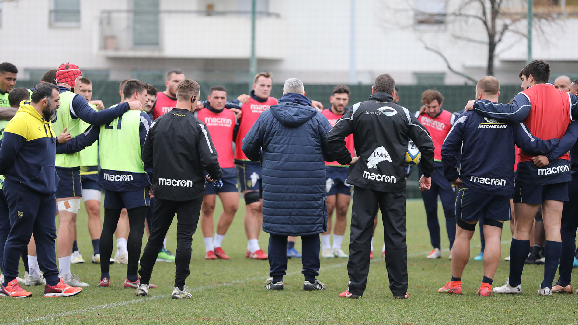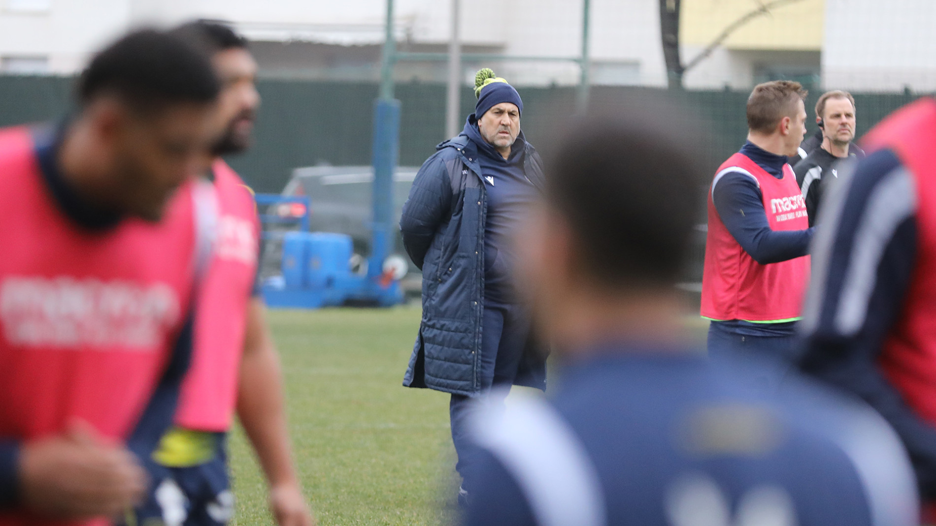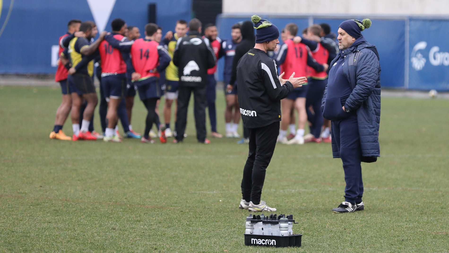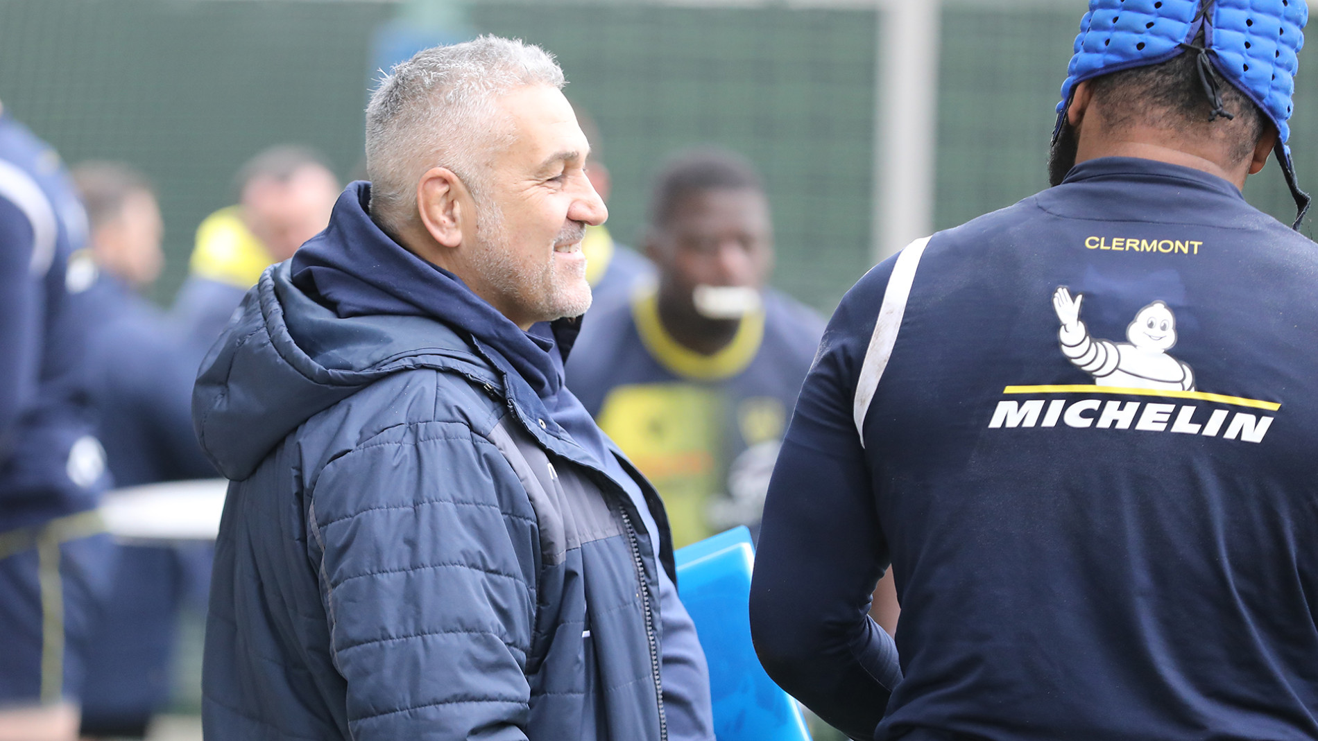 Il ne faut pas longtemps pour comprendre que la visio n’est pas vraiment le « truc » de Christophe Urios, l’entraîneur clermontois y préfère les échanges charnels, directs et l’authenticité. Et même s’il est encore dans une phase normale d’observation du fonctionnement du club et de ceux qui le composent, sa présence impose un certain charisme. Dans un style très différent de celui de son prédécesseur proche de l’action, Christophe supervise et alterne entre les différents ateliers animés par ses adjoints. Lui contrôle, ajuste et intervient ponctuellement. Il encourage ou corrige en parlant aux hommes, sans intervention directe sur la séance. « Je ne suis jamais trop dans l’animation, mes adjoints sont bien meilleurs que moi pour cela ». Pendant que les ateliers s’enchainent et que l’intensité monte l’entraîneur des Jaune et Bleu se rapproche et surveille les lancements, demandant de l’enthousiasme et de la précision. Entre chaque coupure, il échange avec ses adjoints, glisse quelques mots à ses joueurs. En fin séance, c’est lui qui prend la main et conclue le collectif.