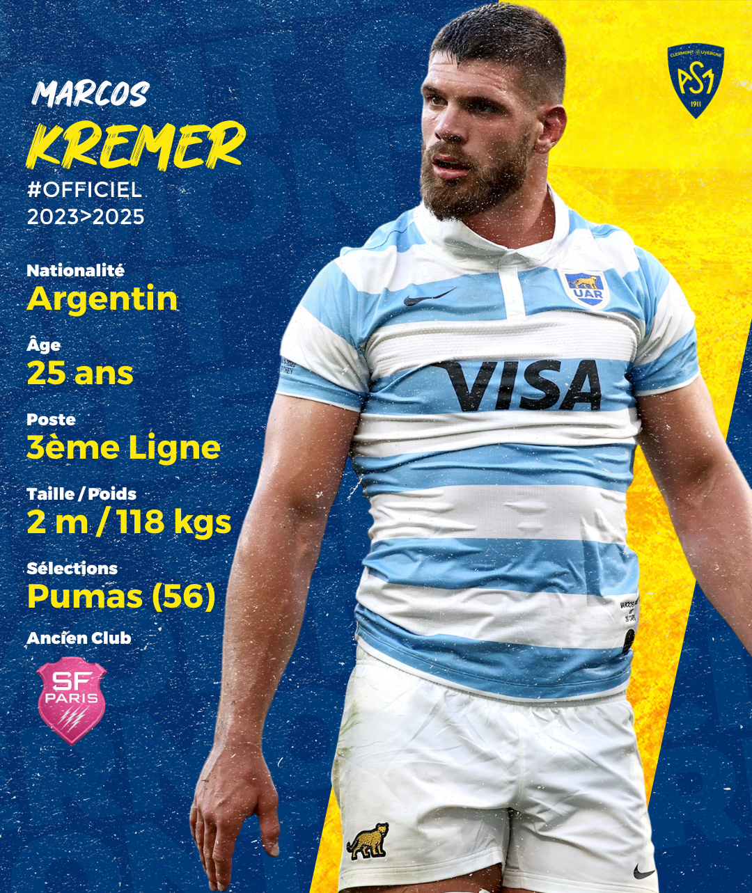 L’international Pumas, Marcos Kremer (25 ans, 56 sélections) évoluant en seconde ou en troisième ligne vient de s’engager avec l’ASM Clermont Auvergne pour les deux prochaines saisons. Le combattant argentin, actuellement au Stade Français, rejoindra les Jaune et Bleu dès la saison prochaine.