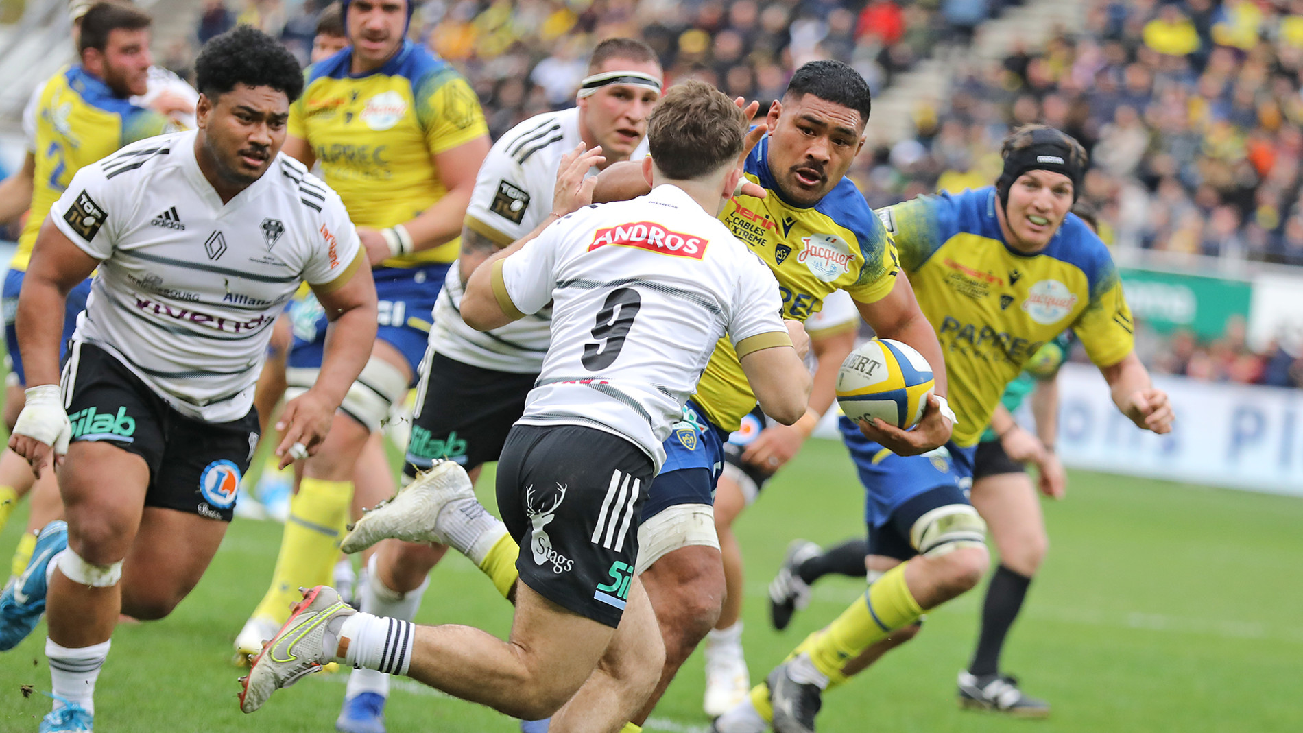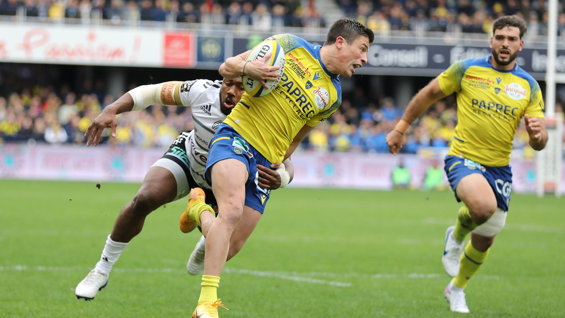 Les hommes de Christophe Urios ont fait ce qu’il fallait pour marquer leur territoire, prenant d’assaut la ligne d’avantage aussi bien défensivement qu’offensivement dès le coup d’envoi. Les charges de Falgoux, Fourcade, Lavanini, Lanen et Lee ont rapidement usé la défense briviste qui s’est montrée bien trop indisciplinée. Clermont, tel un rouleau compresseur récite son rugby de combat : pénalité, touche, ballon porté et marque dès la 13ème minute profitant d’une double infériorité numérique. En neutralisant l’arme principale des Corréziens : la touche, les Jaune et Bleu ont fait une grande partie du boulot, réduisant les visiteurs à de la défense par du jeu au pied. Plutôt efficaces dans ce domaine, les joueurs du CAB ont retardé l’échéance et repoussé le danger tout en offrant des espaces aux attaquants clermontois à l’image de Bautista Delguy qui en dézonant a mis beaucoup d’incertitude sur la défense adverse. L’ailier argentin est d’ailleurs à l’origine de la deuxième réalisation des Auvergnats en déboulant sur son aile avant de trouver un soutien. Anthony Belleau attaque la ligne et fait la différence deux temps de jeu plus tard (24e) prenant de vitesse le replacement défensif corrézien. Parfois un peu brouillon par excès d’envie, les Auvergnats ajouteront toutefois un troisième essai avant la pause grâce à un deuxième ballon porté parfaitement maitrisé par les hommes forts du pack auvergnat.