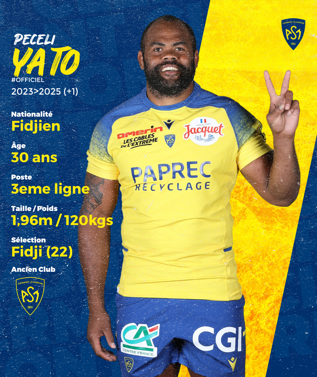 Après les signatures des internationaux Mohamed Haouas (France, 16 sélections), Folau Fainga’a (Australie, 38 sel) Rob Simmons (Australie, 106 sel), Pita-Gus Sowakula (All-Black, 2 sel), Marcos Kremer (Arg 56 sélections) ainsi que les prolongations récentes des cadres Etienne Falgoux, Rabah Slimani, Cristian Ojovan et Fritz Lee, celle de Peceli Yato (2 saisons +1) s’inscrit pleinement dans la volonté de Christophe Urios de densifier et d’épaissir le pack auvergnat dès la saison prochaine. Quelques discussions sont encore en cours et devraient se conclure dans les semaines à venir afin de dessiner définitivement les contours du paquet d’avants des Jaune et Bleu dont Peceli Yato fera partie au moins jusqu’en juin 2025 (option 2026).
