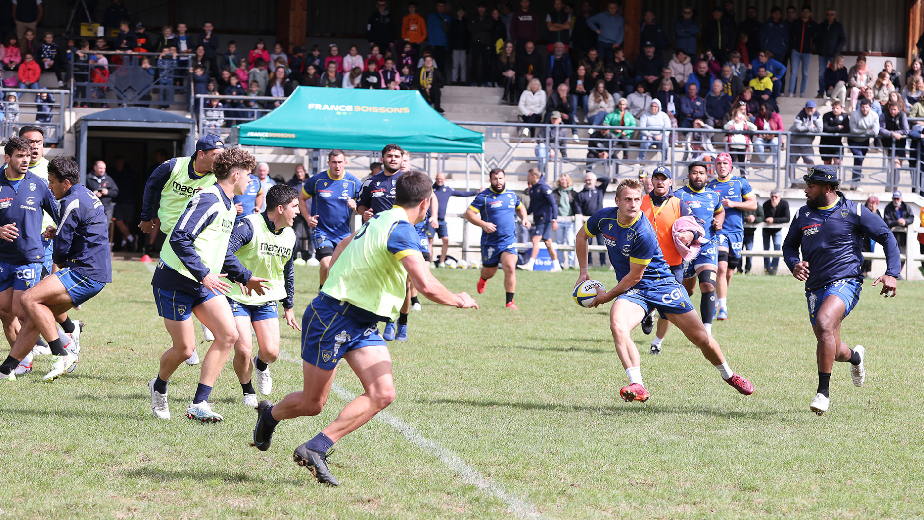 Au bord de Lander, au pied de la vieille ville de Saint-Flour dominée par la majestueuse cathédrale Saint-Pierre (l’une des quatre que compte l’Auvergne), les Jaune et Bleu ont été accueillis les bras ouverts par le Rugby Club de Saint-Flour pour le premier entrainement délocalisé de l’histoire dans cette partie du Cantal. Pour le plus grand bonheur des nombreux supporters venus en masse à la rencontre des hommes de Christophe Urios, ceux-ci ont pu assister à une séance de rugby total très soutenue avant de profiter de moments de partage privilégiés avec les Sanflorains qui ont multiplié les autographes et selfies.