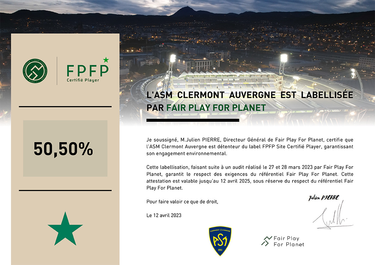 Créé par Julien Pierre, ancien joueur international de l’ASM Clermont Auvergne, ce label atteste de la démarche de développement durable dans laquelle le club et ses sites sont engagés. L’ASM a été auditée durant plusieurs mois par les experts FPFP, se basant sur un questionnaire exhaustif de plus de 300 questions. L’identification des caractéristiques environnementales de ce cahier des charges a été réalisée en coopération avec l’ADEME, l’Agence de la transition écologique. Le label est décerné pour une période de 2 ans, à l’issue de laquelle un nouvel audit sera mené afin de déterminer si le club peut conserver son label et progresser dans les différents niveaux (Player, Engaged, Confirmed).