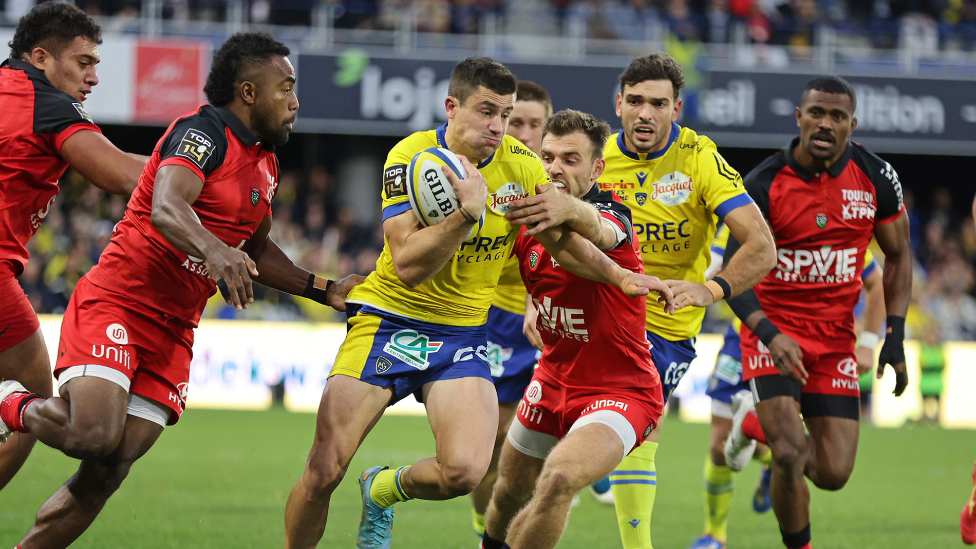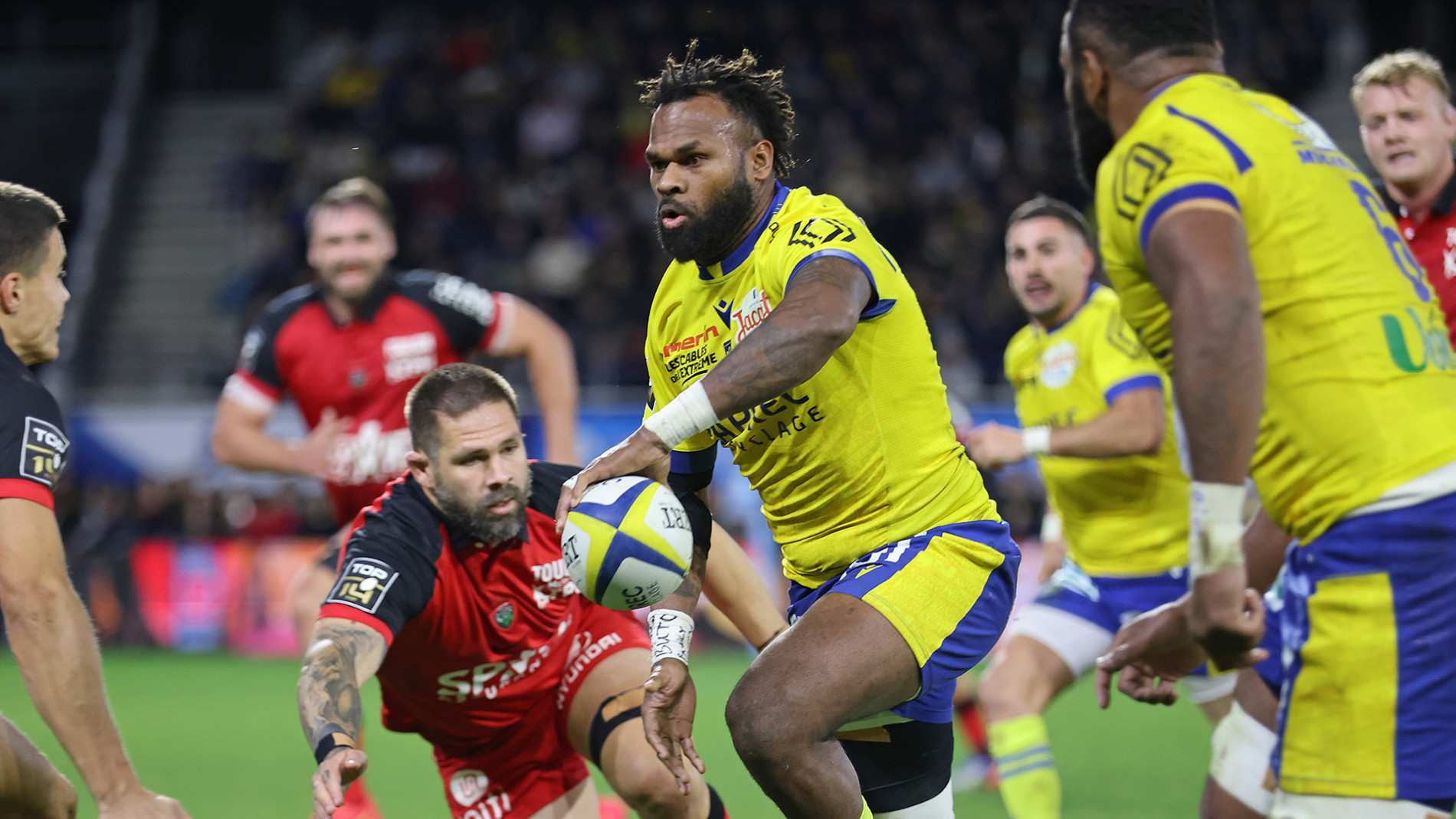 Contrairement à la réception de Bayonne, il y a 15 jours, les hommes de Christophe Urios n’ont pas su imposer leur pression territoriale dans le camp des visiteurs s’appuyant sur son paquet d’avants conquérants. Ils ont ainsi joué la plupart des 40 premières minutes dans leurs 60 mètres. Cela ne les a pas empêchés de prendre les commandes de la rencontre après une pure merveille de relance dans leurs 22 mètres après un ballon volé en touche, où l’ailier argentin Bautista Delguy, en grande forme, a une nouvelle fois pu faire admirer sa vista. Quelques temps de jeu plus tard et à l’autre bout du terrain c’est Peceli Yato qui prend le ballon sous le bras et renverse tout sur 30 mètres pour un premier essai superbe. Mais le RCT et sa défense en pointe font déjouer les Auvergnats qui ont toute les peines du monde à sortir de leur camp et s’exposent. Lolesio convertit une première pénalité (15e) avant de continuer à grappiller du terrain s’approchant de la zone de marque de l’ASM. La première pénal-touche file derrière la ligne après un ballon relevé par le jeune troisième ligne Coulon (7-10) après la transformation de l’ouvreur australien. La réaction clermontoise ne se fait pas attendre et dès le renvoi, l’ASM s’installe dans le camp toulonnais grâce aux appuis de Delguy et la puissance de Moala. Sébastien Bézy anime bien autour de ses avants avec son compère Benjamin Urdapilleta qui démarque d’une longue passe son talonneur, Folau Fainga’a isolé en bout de ligne. En puissance le Wallaby file derrière la ligne redonnant l’avantage aux siens (14-10). Récompensé de sa première période solide, Toulon récupère une nouvelle pénalité à la sirène leur permettant de recoller à un point à la pause (14-13).