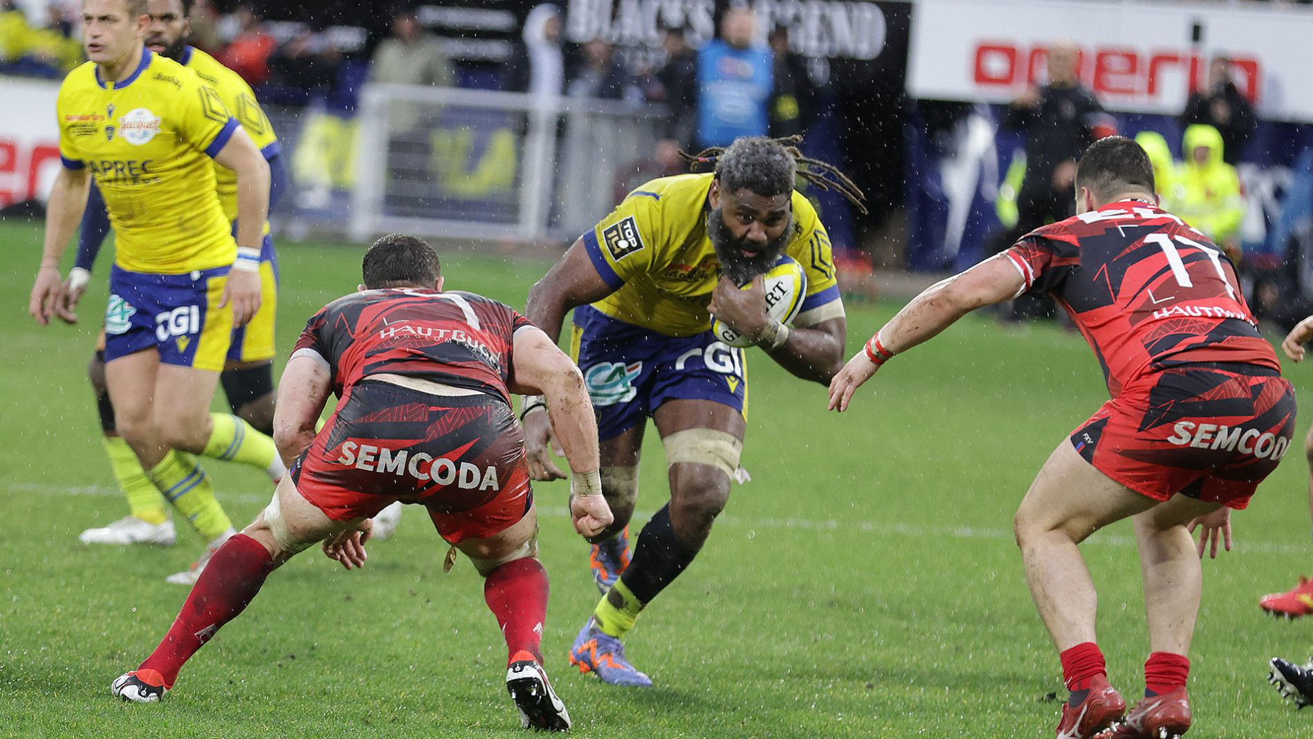 Battue par la pluie et le vent, la pelouse du Michelin n’était pas le lieu idéal pour développer du rugby de mouvement. Clermont a ainsi démarré par de l’affrontement frontal, face au vent, mais à force de butter sans marquer, le doute n’a fait que s’accentuer. Après un premier quart d’heure improductif, ce sont même les Oyomen qui ont profité d’un hors-jeu clermontois sur un coup de pied pour ouvrir le score, renforçant encore un peu plus la pression et le doute. Dans de telles conditions, l’occupation fut le principal enjeu des deux équipes qui ont multiplié le jeu au pied sans que l’une ou l’autre ne prenne réellement l’avantage. Revenus dans la zone de marque, les Auvergnats laissent filer de nouvelles occasions près de la ligne des visiteurs qui s’arcboutent en défense avec solidarité. Rien n’y fait, Clermont ne score pas et garde cette pression durant de longues minutes. Une pénalité de Jules Plisson ouvre enfin la marque à la 36e minute après un maul écroulé remettant ainsi les deux équipes à égalité. Mais de nouvelles maladresses dans le jeu aérien fragilisent les Auvergnats qui s’exposent juste avant la pause offrant à Miotti l’occasion de faire virer les joueurs d’Oyonnax avec 3 points d’avance (3-6 à la pause).