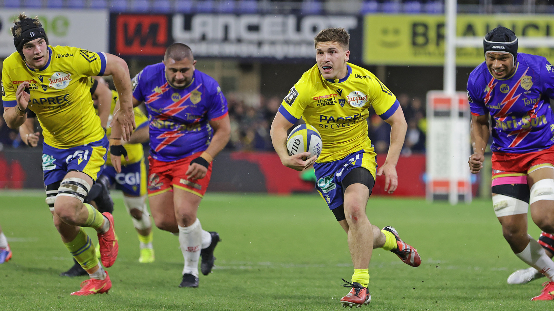 Les conditions climatiques très venteuses et pluvieuses en fin de rencontre ne favorisaient pas vraiment le jeu de mouvement pourtant les Clermontois vont faire mentir les pronostics en mettant le feu sur les extérieurs. C’est Bautista Delguy qui est le premier à s’illustrer sur un ballon récupéré qu’il va poursuivre au pied sur 70 mètres. La vitesse, et la conduite de balle de l’argentin fait la différence et Bauti file derrière la ligne avant de célébrer au milieu du public clermontois. Paris réagit immédiatement, là aussi sur les extérieurs, en trouvant des intervalles dans la défense clermontoise pour remettre les deux équipes dos à dos. La défense des Jaune et Bleu va alors serrer les boulons et élever le niveau d’agressivité dans le sillage de Fritz Lee, Giorgi Beria, Marcos Kremer ou Thibaud Lanen. Le seconde ligne auvergnat s’illustrera quelques minutes plus tard après une merveille de percée de Jauneau qui retrouve Thibaud Lanen. Dans le contact, Thibaud adresse une chistera très bien inspirée vers son demi-de-mêlée pour un essai synonyme de premier break. Le match bascule à la 26ème minute après un coup de coude de Halaifonua (déjà auteur quelques minutes plus tôt d’un plaquage très limite sur Etienne Fourcade) qui laissera ses coéquipiers à quatorze après un carton rouge distribué par Monsieur Charabas. Les avants fixent la défense parisienne sur un ballon porté avant que Baptiste Jauneau écarte vers Newsome. L’arrière clermontois allonge à son tour pour libérer le couloir de Raka. Inarrêtable, l’ailier clermontois plonge pour son premier essai à la 27e. Anthony Belleau rajoute 3 points et permet à son équipe de tourner avec un avantage de 11 points (24-13)
