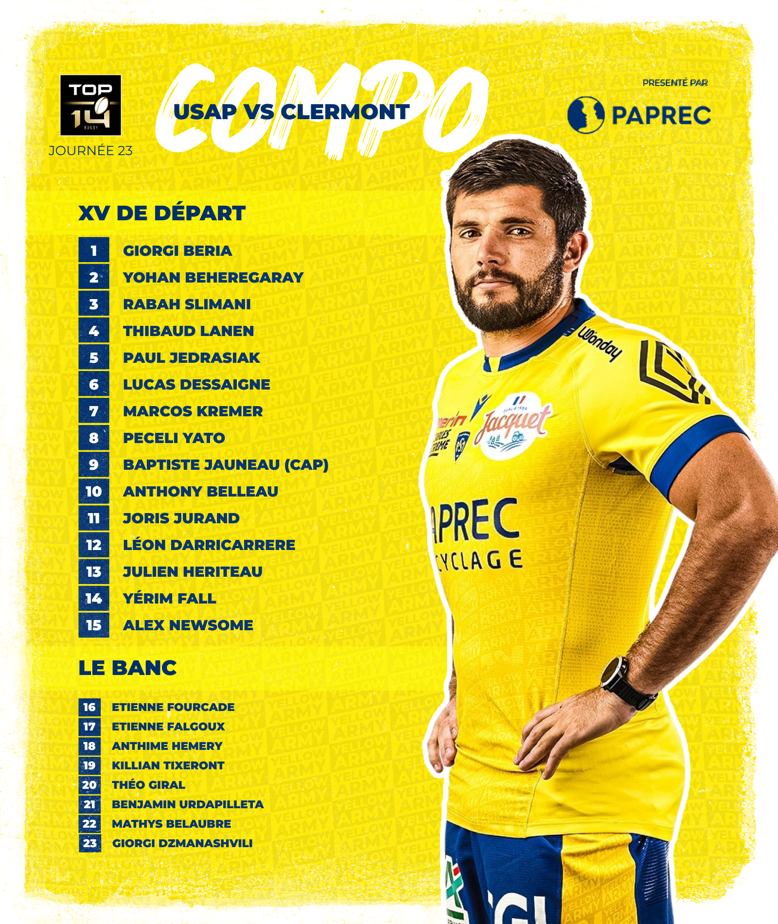 Un seul changement en première ligne avec la rotation entre les talonneurs Etienne Fourcade et Yohan Beheregaray, pendant que les deux piliers Giorgi Beria et Rabah Slimani (10èmetitularisation consécutive) restent en place. Le retour d’Etienne Falgoux (remis de sa lésion musculaire au biceps) est un bol d’air pour l’effectif auvergnat qui retrouve un deuxième spécialiste à gauche. Giorgi Dzmanashvili, couvrira ainsi l’axe droit de la mêlée montferrandaise. Pour la première fois de la saison, Thibaud Lanen et Paul Jedrasiak seront associés à l’attelage alors qu’Anthime Hemery (lancé sur la pelouse de Bordeaux) retrouve le groupe pour ce déplacement à Perpignan.