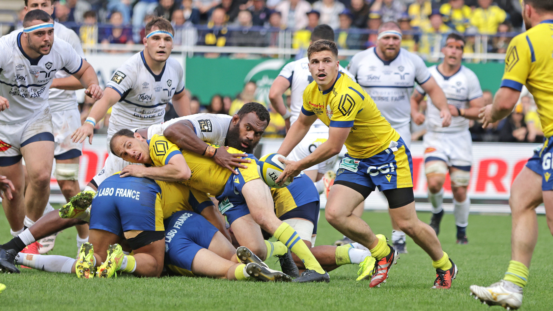 Il faudra un coup de frais en provenance du banc pour redonner de la vigueur aux Auvergnats qui retrouvent de la vitesse et du dynamisme en début de seconde période. Baptiste Jauneau accélère le ballon de ruck en ruck et une redoublée de Benjamin Urdapilleta pour Alex Newsome fait la différence. L’arrière australien retrouve Joris Jurand en bout de ligne et dans cette situation même avec trois Castrais sur le dos, le finisseur clermontois termine sa course en terre promise pour offrir temporairement le bonus à son équipe. Il reste une demi-heure à jouer et Castres ne compte pas en rester là. Clermont est pourtant à l’initiative du jeu mais perd quelques ballons dont se nourrissent les Tarnais. Hulleu récupère le ballon et amorce un terrible contre qu’Etienne Fourcade finira par reprendre à quelques mètres de la ligne d’essai, le demi-de-mêlée Fernandez a bien suivi et reprend le bonus offensif aux Clermontois. Le va-et-vient se poursuit une dizaine de minutes plus tard lorsque Léon Darricarrère profite d’une conquête souveraine pour prendre toute la défense castraise à contre-pied sur un lancement de jeu décisif. Le match est dans la poche des hommes de Christophe Urios qui vont pourtant faire trembler le Michelin puisque Papali’i traverse le terrain pour un essai qui jette un froid et efface le point du bonus offensif des Auvergnats. Une fin de rencontre en forme de montagnes russes qui a le mérite de rallumer la Yellow Army qui pousse derrière son équipe pour récupérer ce point longtemps espéré… il faudra tout : une nouvelle prise de balle en touche parfaite et une bonne inspiration de Sébastien Bézy qui sert Pita-Gus Sowakula dans le petit côté. Personne ne peut arrêter le puissant néo-zélandais qui franchit la ligne et fait rugir le Michelin.