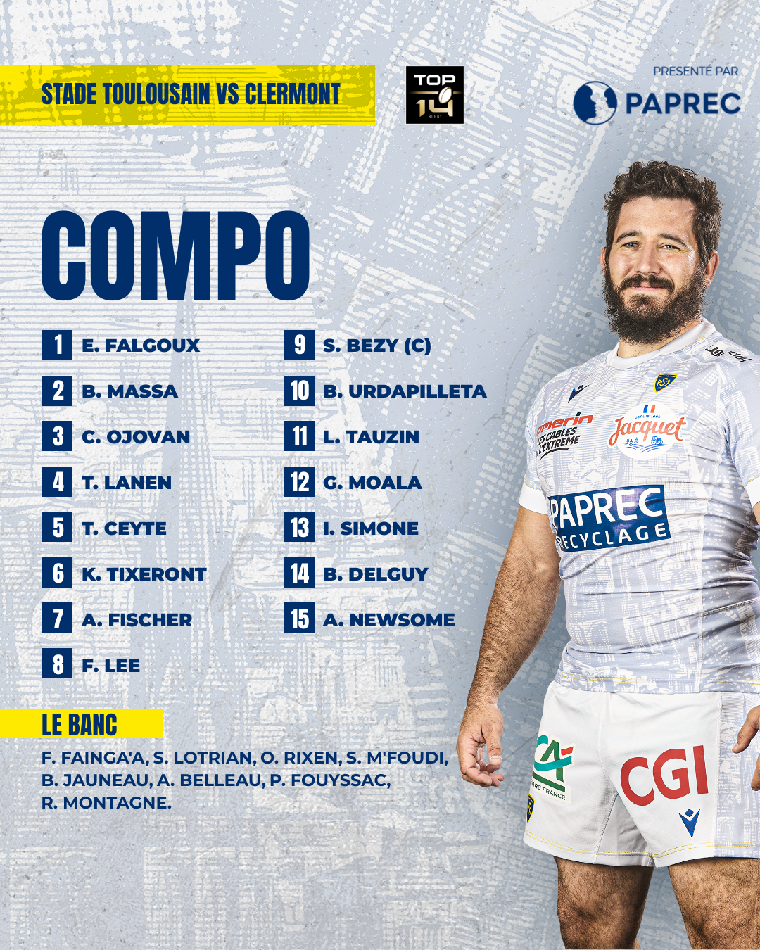 Au centre du terrain, George Moala fait son retour à la compétition et jouera pour la première fois de la saison avec Irae Simone, relancé la semaine dernière. Du solide et de l’expérience dans un secteur où les Toulousains imposent beaucoup de mouvements et de dangers. Sur les ailes, Bautista Delguy reste en place après une première belle sortie en Jaune et Bleu et sera associé à Lucas Tauzin qui glisse sur l’aile après 4 titularisations au centre du terrain. Alex Newsome complète le XV de départ dans un groupe que réintègre Pierre Fouyssac pour la première fois de la saison.
