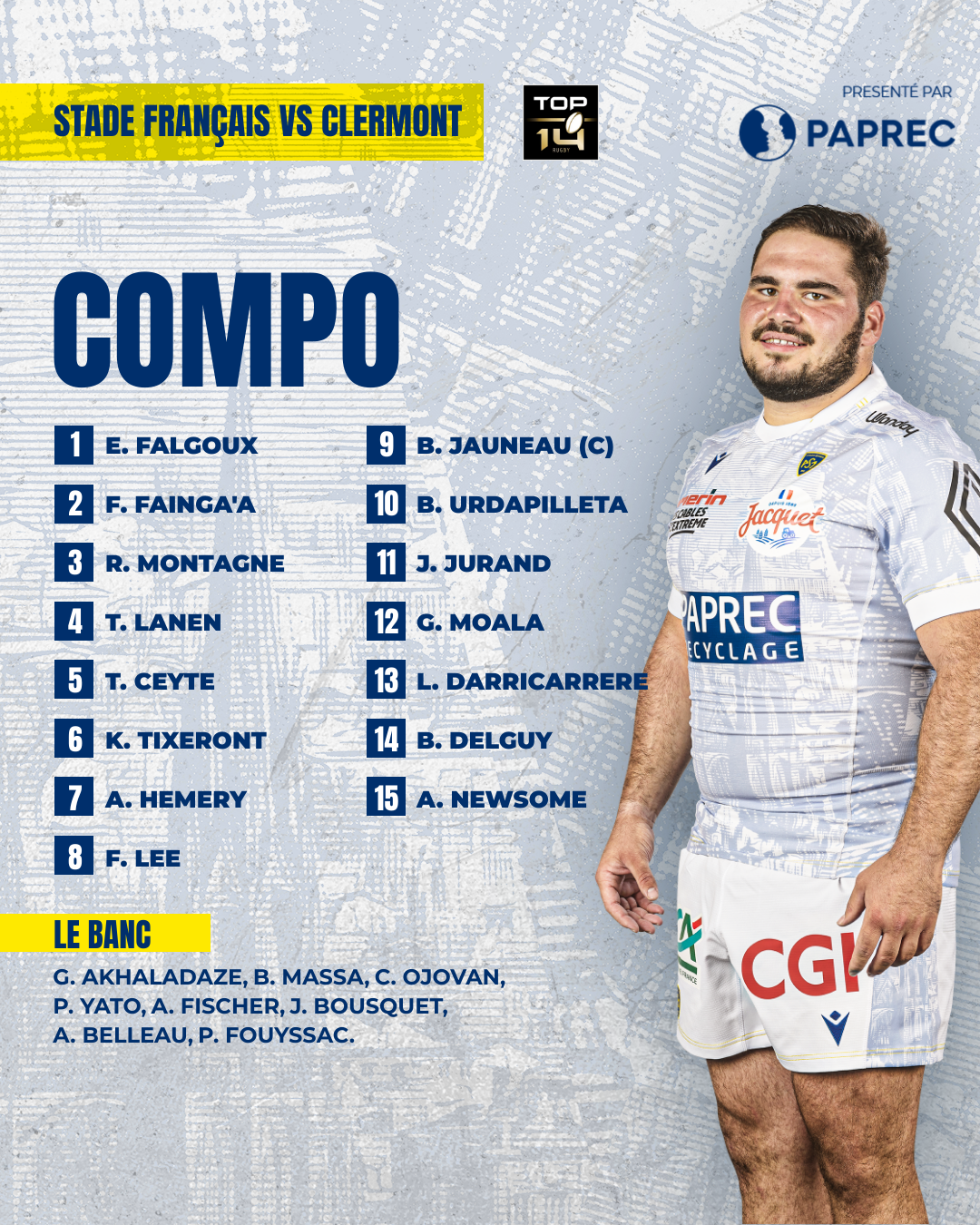 Pas de changement à la charnière où Baptiste Jauneau et Benjamin Urdapilleta mèneront le jeu des Auvergnats sur la pelouse parisienne. Au centre du terrain George Moala, ménagé la semaine dernière pour son retour à la compétition, signera sa quatrième titularisation de la saison. Le centre tongien sera associé à Léon Darricarrère (6ème titularisation en 8 matchs cette saison). Les blessures dans le fond du terrain (Alivereti Raka et Kylan Hamdaoui) ont obligé le staff à une réorganisation puisque Alex Newsome récupère le poste d’arrière et Joris Jurand intègre le Xv de départ à l’aile en compagnie de Bautista Delguy qui enchaine depuis son retour avec les Pumas.