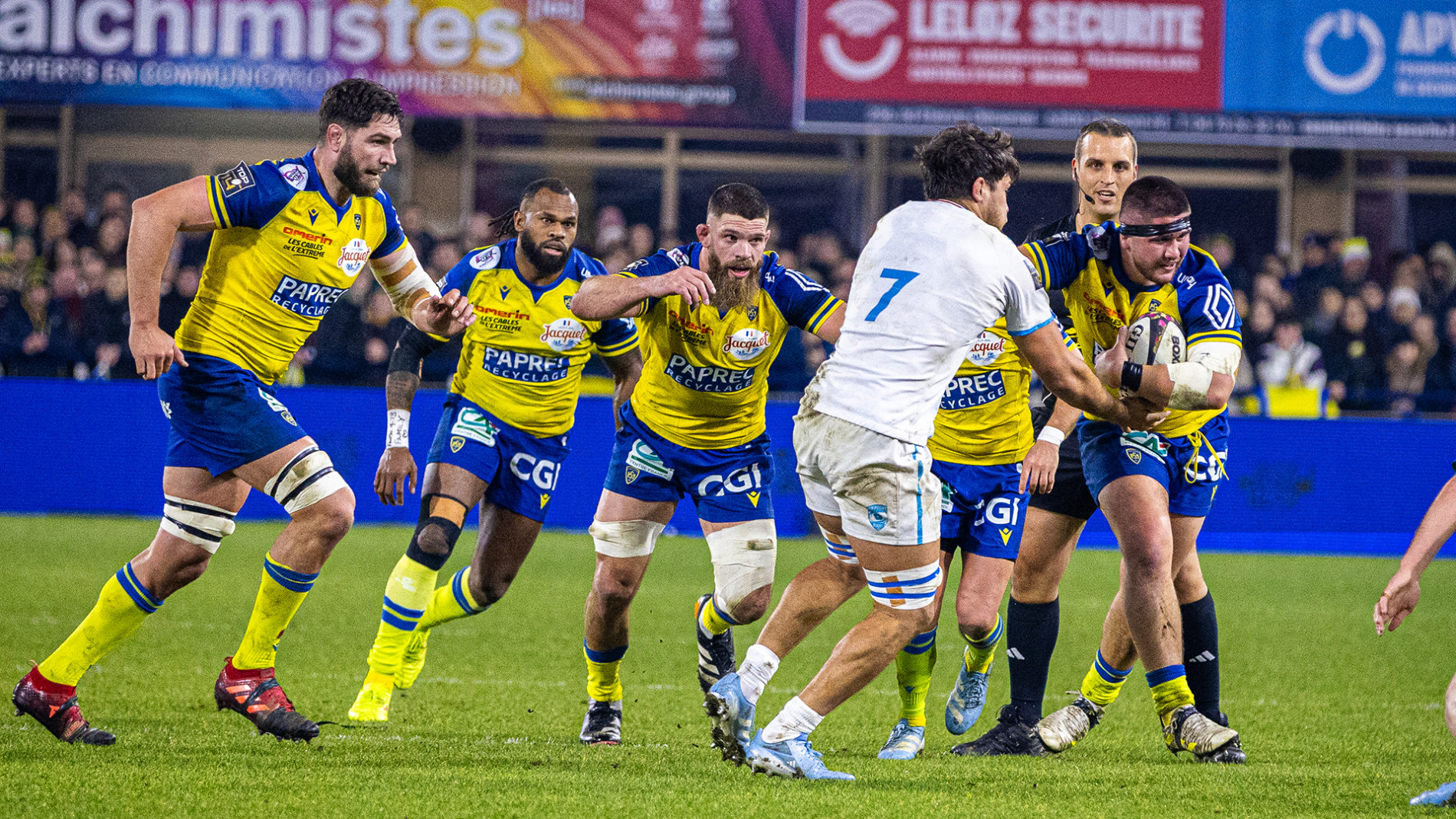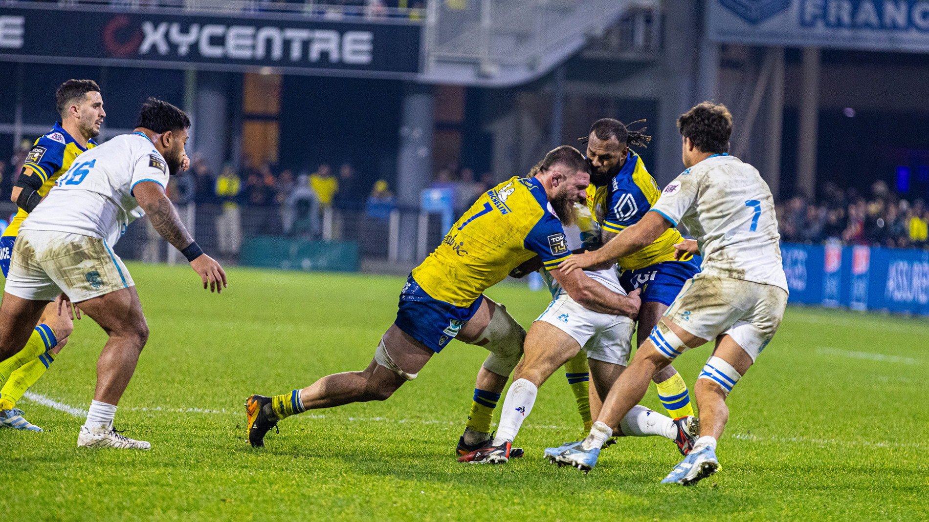 Les Jaune et Bleu sont passés à côté de leur entame de match, laissant dès les premières minutes de jeu, les Héraultais s’installer dans le camp auvergnat. Imprécis dans les transmissions et en difficulté en mêlée, Clermont peine à trouver le bon rythme et encaisse ses premiers points dès la 7ème minute de jeu. La guerre au sol fait rage. Les Héraultais mettent beaucoup d’engagement pour ralentir tous les ballons des Jaune et Bleu bien aidés par un arbitrage permissif. Et cela fonctionne, l’ASM ne parvient pas à mettre son jeu rapide en marche et doit se contenter d’un bras de fer usant saccadé par de nombreux coups de sifflet d’un côté et de l’autre. Il faudra que les hommes de Christophe Urios retrouvent de l’efficacité dans leur conquête en imposant de gros ballons portés qui mettent en difficulté les Héraultais. Le premier avec une belle inspiration de Sébastien Bézy, très bon toute la soirée, qui provoque un retour le long de la ligne de touche où Etienne Fourcade s’était fait oublier. Le talonneur clermontois inscrit son premier essai et récidive quelques minutes plus tard sur, cette fois-ci, un véritable ballon porté d’école après une belle prise de Simmons (12-3 à la demi-heure de jeu). Mais les Auvergnats ne parviennent pas à se détacher des Héraultais qui reviennent aussitôt dans le jeu après un gros travail des avants et une filouterie de Reinach. La fin de première période est confuse entre les appels vidéo et les pénalités retournées, l’atmosphère monte au Michelin d’autant que Clermont proche de la ligne du MHR ne parvient pas à faire sauter le dernier verrou.