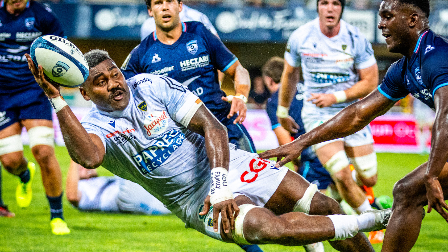 Les Auvergnats ont pris ce match par le bon bout en imposant une terrible agressivité défensive et un parfait sens tactique derrière le Maestro Benjamin Urdapilleta qui a fait reculer l’arrière garde montpelliéraine grâce à la précision de son jeu au pied. La bataille d’occupation gagnée, les Clermontois vont rapidement se payer grâce à un contre opportuniste de Thomas Ceyte qui profite du pressing de son équipe pour aplatir entre les poteaux dès la 6ème minute. Les Héraultais sont étouffés par les montées défensives des infatigables Killian Tixeront et Alexandre Fischer auteurs d’une rencontre de très haut niveau. Clermont tient sa rencontre et profite de l’indiscipline des locaux qui subissent tous les impacts. Benjamin Urdapilleta, parfait face aux perches, fait grimper l’addition avant que son jeune compère de la charnière ne se démène pour exploiter le moindre intervalle et faire jouer ses coéquipiers. Les avants poursuivent le travail de sape et font mal aux Héraultais. Un ballon porté est tout près de filer dans l’en-but mais une nouvelle faute retarde l’échéance. C’est trop pour Monsieur Gasnier qui accorde un essai de pénalité et réduit les locaux à 14. Les Auvergnats ont même d’autres occasion de filer derrière la ligne mais quelques imprécisions laissent le MHR dans le match à la pause.