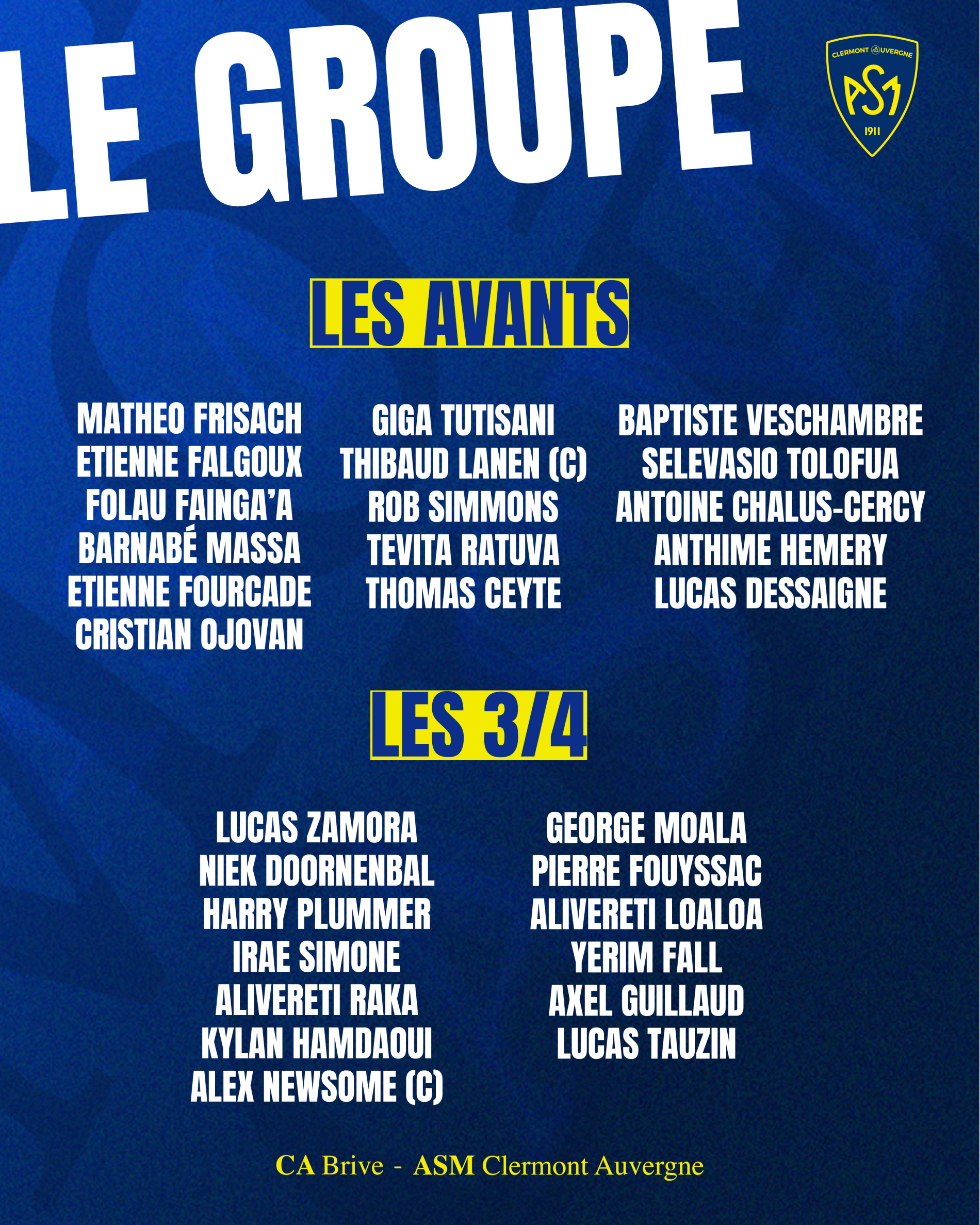 Pour le premier match de préparation des Jaune et Bleu, demain à 21 heures à Brive,Christophe Urios aura à sa disposition un groupe de 30 joueurs repartis en deux équipes qui se partageront les mi-temps sur la pelouse du Stadium. Ce sera la première occasion pour les supporters clermontois de voir à l’œuvre l’ouvreur all-black Harry Plummer mais aussi les recrues Tevita Ratuva, Selevasio Tolofua, Lucas Zamora ou Alivereti Loaloa.