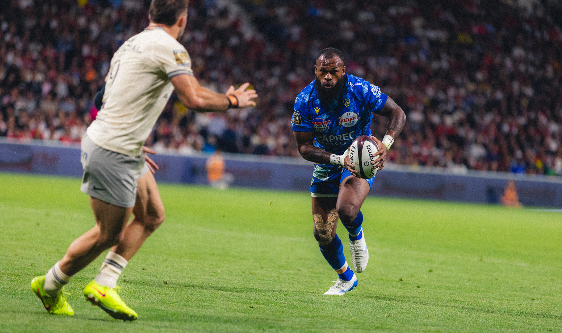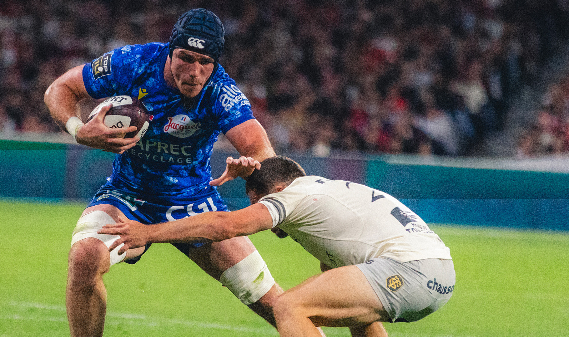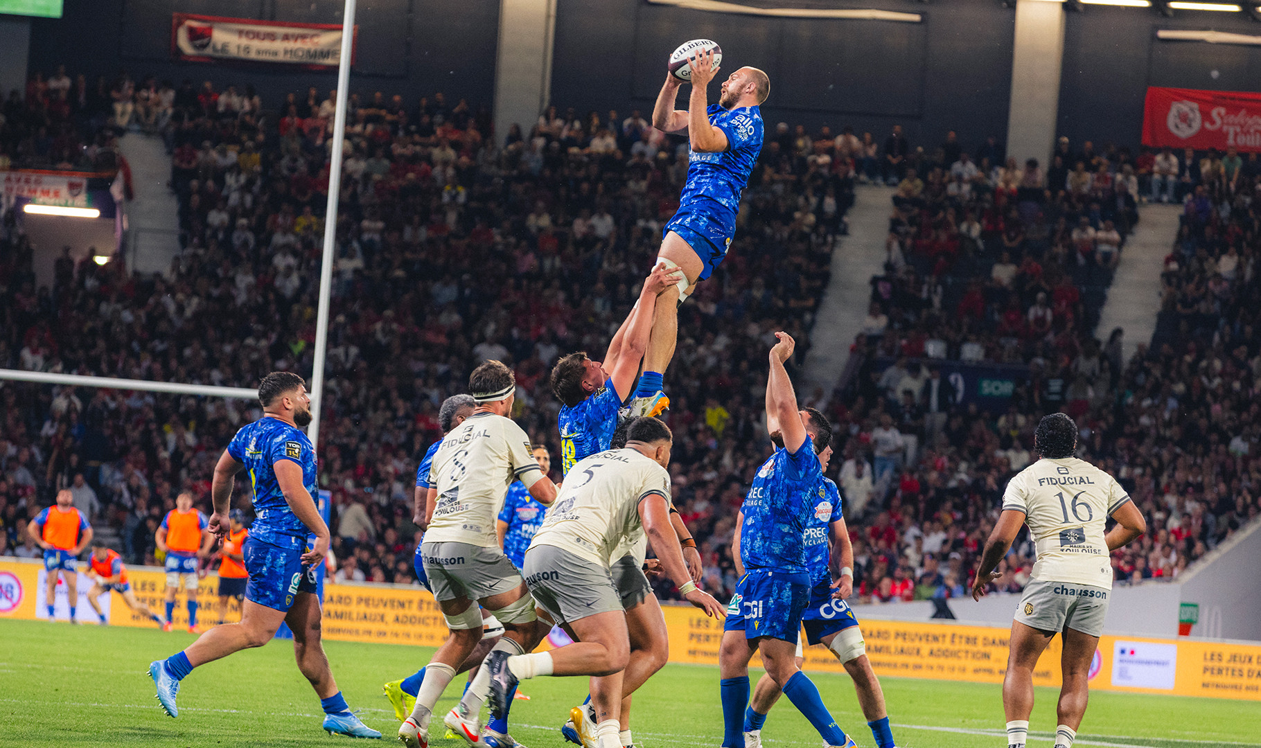 Dans un Stadium chauffé à blanc, les choses ne pouvaient pas plus mal débuter pour les Clermontois qui voient Teddy Thomas filer le long de la ligne de touche pour l’essai le plus rapide du championnat : 45 secondes. Les Auvergnats pris dans la tempête subissent tous les impacts et reculent face à des Toulousains qui déploient leur jeu de mouvement habituel. Le premier ballon porté file derrière la ligne et quelques minutes plus tard. La note commence à enfler d’autant que Paul Graou signe une minute plus tard un troisième essai après un nouveau mouvement plein de talent. A la 11èmeminute de jeu, les écrans géants du Stadium affiche un très lourd 21 à 0 en faveur des Champions de France. Et commme si cela ne suffisait pas Marcos Kremer quitte pendant 20 minutes ses coéquipiers pour un plaquage trop haut (carton orange). Rien ne va plus et pourtant c’est à cet instant que le momentum s’inverse. Clermont jusque-là transparent va se densifier à l’image de son centre, Léon Darricarrère qui renverse tout sur son passage et se porte à la conclusion de la première action de son équipe pour un essai qui relance le match. A la demi-heure de jeu, après une action confuse en touche, Baptiste Jauneau, comme il sait si bien le faire dynamise derrière un ruck et surprend la défense toulousaine pour un essai en solitaire. L’ASM est revenu dans le match et cela même si Harry Plummer est, à son tour, prié de quitter ses coéquipiers pour un deuxième plaquage trop haut.