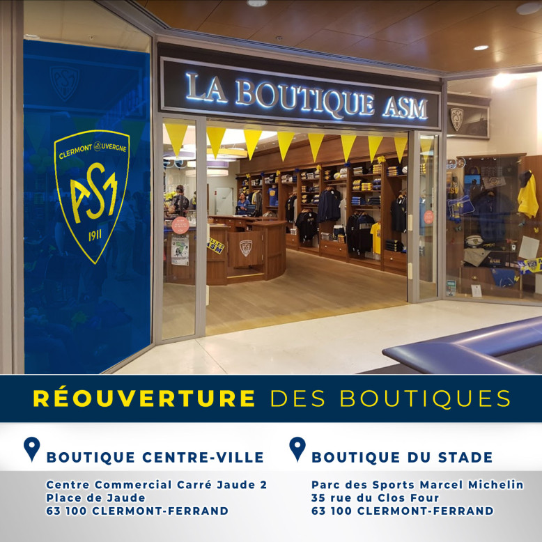 Les boutiques officielles de l'ASM réouvrent leurs portes aujourd'hui, mercredi 19 mai 2021. Nous sommes très heureux de retrouver notre Yellow Army et impatients de vivre ensemble cette fin de saison.