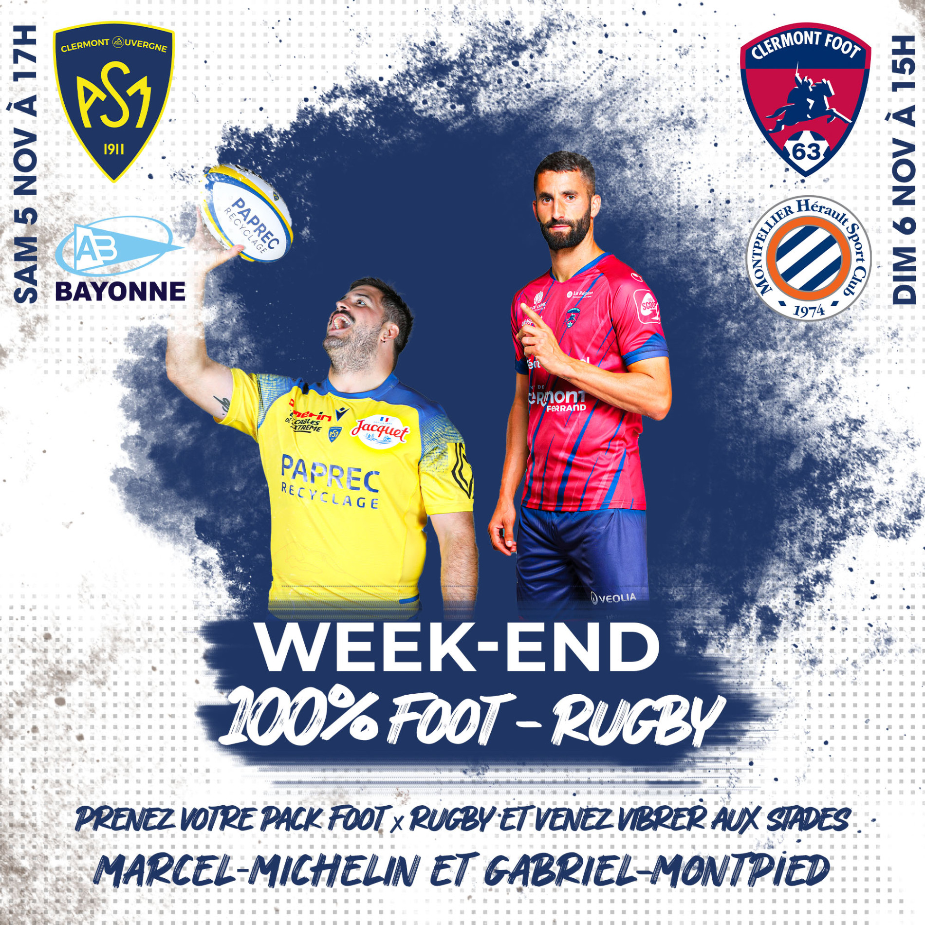 C’est une grande première « 100% Foot / Rugby » pour les deux clubs clermontois qui proposeront à leurs supporters de participer aux deux rencontres de Top 14 et de Ligue 1 Uber Eats programmées le week-end du 5 et 6 novembre prochain en profitant d’une offre tarifaire attractive. Ainsi, les supporters auvergnats auront l’occasion de voir leurs clubs successivement opposés à l’Aviron Bayonnais au Michelin (samedi à 17 heures) puis au Montpellier Hérault Sport Club au stade Gabriel-Montpied (dimanche à 15 heures). Les packs sont disponibles à la vente dès maintenant.