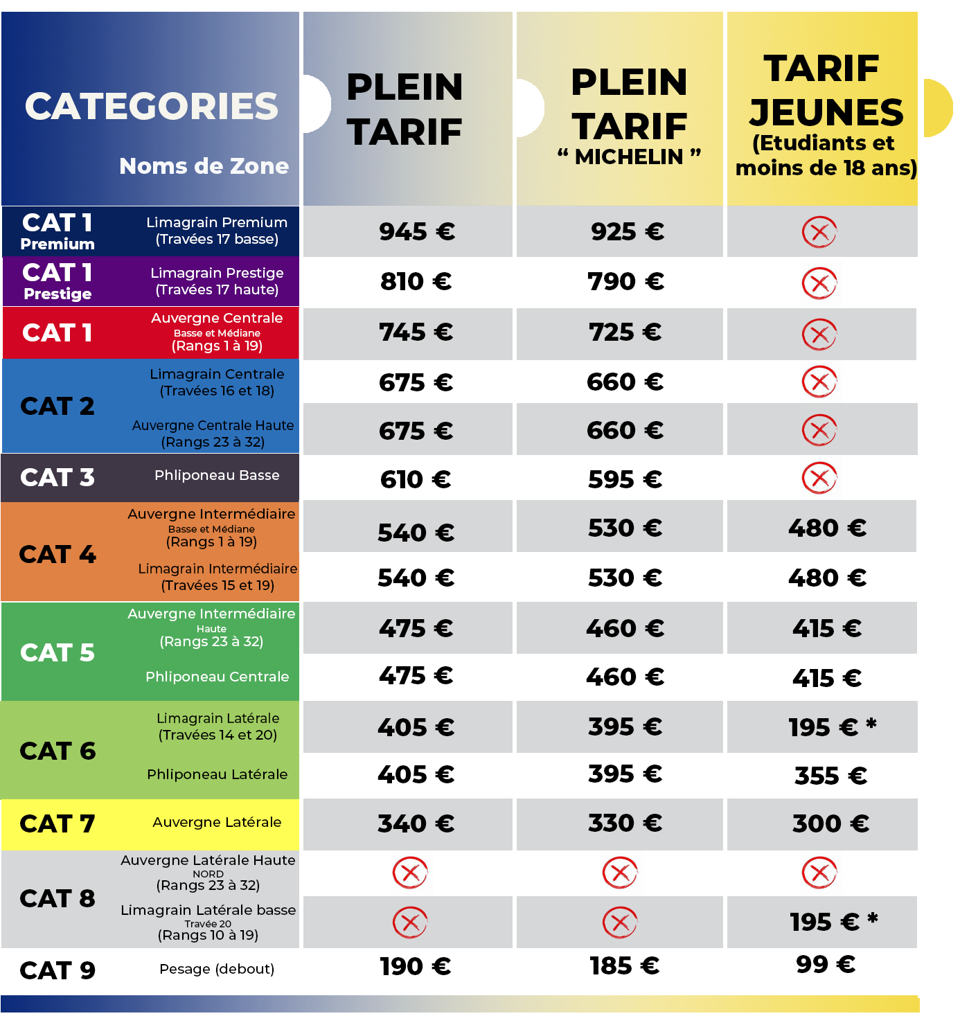 Pour les Jeunes (-18 ans) et les Etudiants, les tarifs spécifiques ne sont plus réservés au Pesage puisque de nouveaux espaces accueilleront les Jeunes dans les Tribunes Auvergne et Limagrain à tarifs spécifiques.