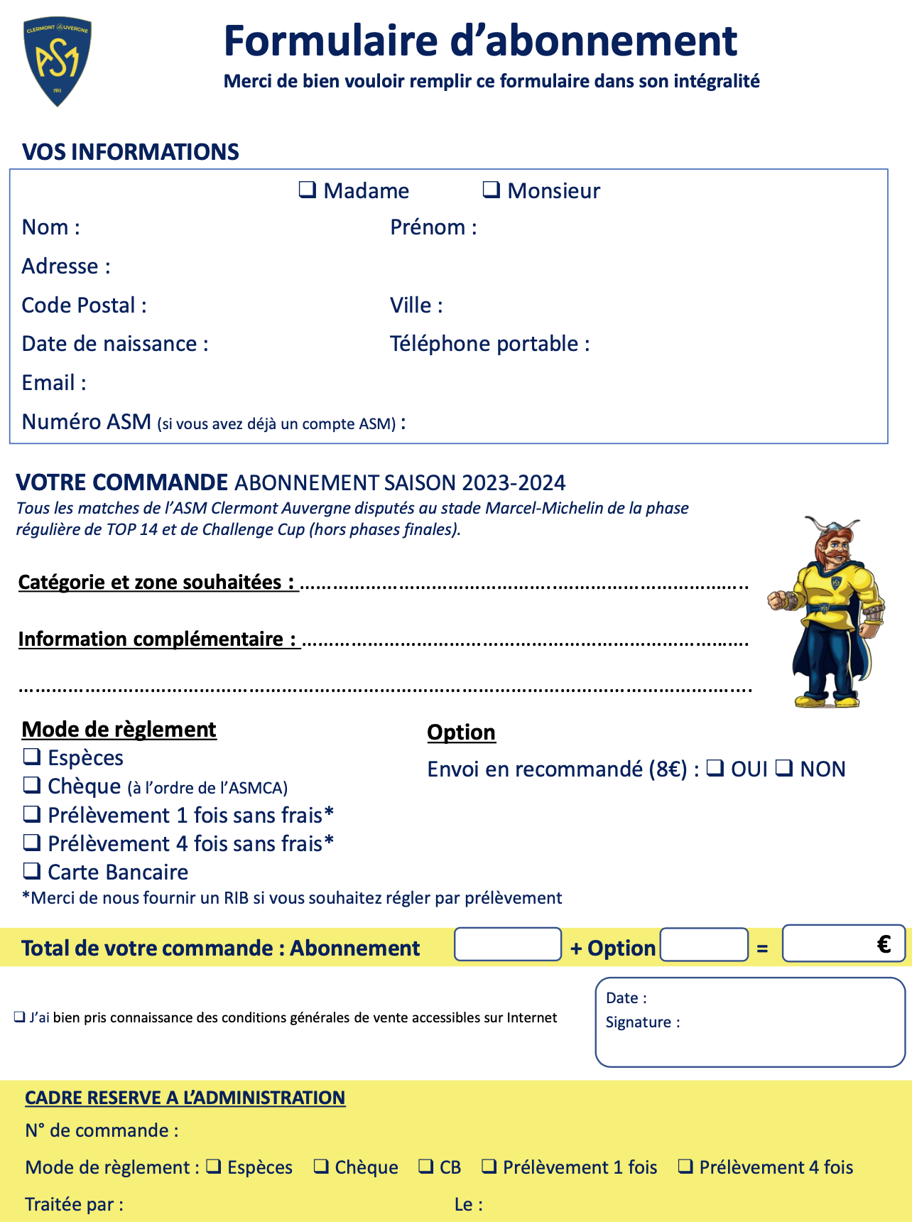 - Envoi par courrier du Formulaire ci-dessous à ASM CLERMONT AUVERGNE - Stade Marcel-Michelin - Service Abonnement - 35 rue du Clos four - 63028 CLERMONT FERRAND