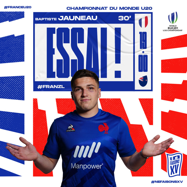 L’expérience des jeunes tricolores en Top 14 a probablement compté dans cette rencontre décisive pour la qualification en demi-finale face aux Baby-Blacks. Avec ses 17 feuilles de match (et plus de 1000 minutes de jeu en Top 14) Baptiste Jauneau a fait preuve de beaucoup de maitrise et d’assurance pour animer avec intelligence et justesse le jeu des Bleuets. Dans le bon tempo, Baptiste a dynamisé le jeu tricolore dans les temps forts s’appuyant sur la puissance de ses avants à l’image de Posolo Tuilagi (auteur d’un doublé) avant d’inscrire son premier essai dans la compétition après un bon soutien intérieur sur son ailier (30e) permettant aux Bleuets d’atteindre la pause sur le score de 21 à 0. En deuxième période, les Baby Blacks ont tenté de réagir profitant des deux exclusions temporaires tricolores (Baptiste Jauneau et Paul Costes) mais la défense a longtemps tenu face aux assauts néo-zélandais réduisant leurs espoirs à néant (victoire tricolore 35 à 14).