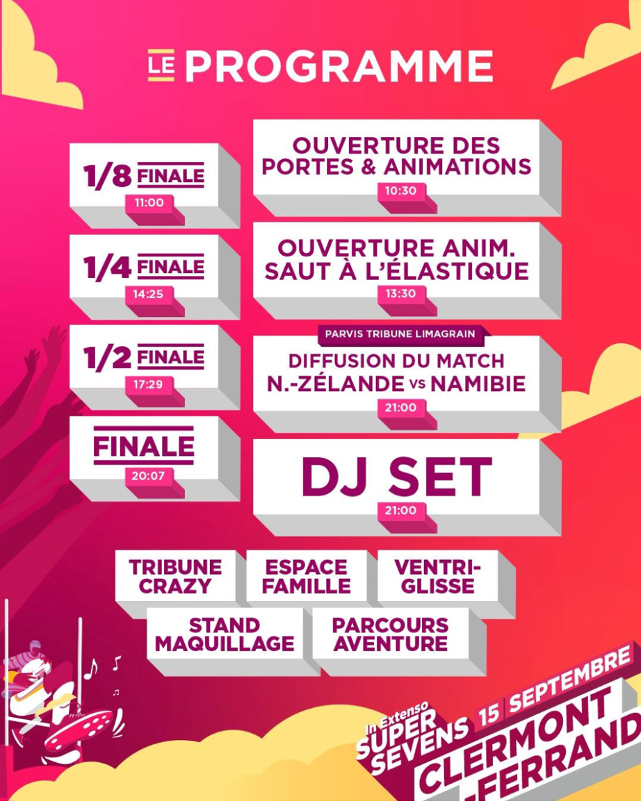 Vendredi sur la pelouse du Michelin, nous vous promettons du spectacle… Il y en aura également partout autour où le dispositif et l’esprit Sevens envahiront l’enceinte clermontoise. Saut à l’élastique, mur d’escalade, tribune crazy, ventre et glisse, Toboggan, Parcours aventure…. et évidemment restauration de 11h à 23h ! Vous allez vous REGALER !
