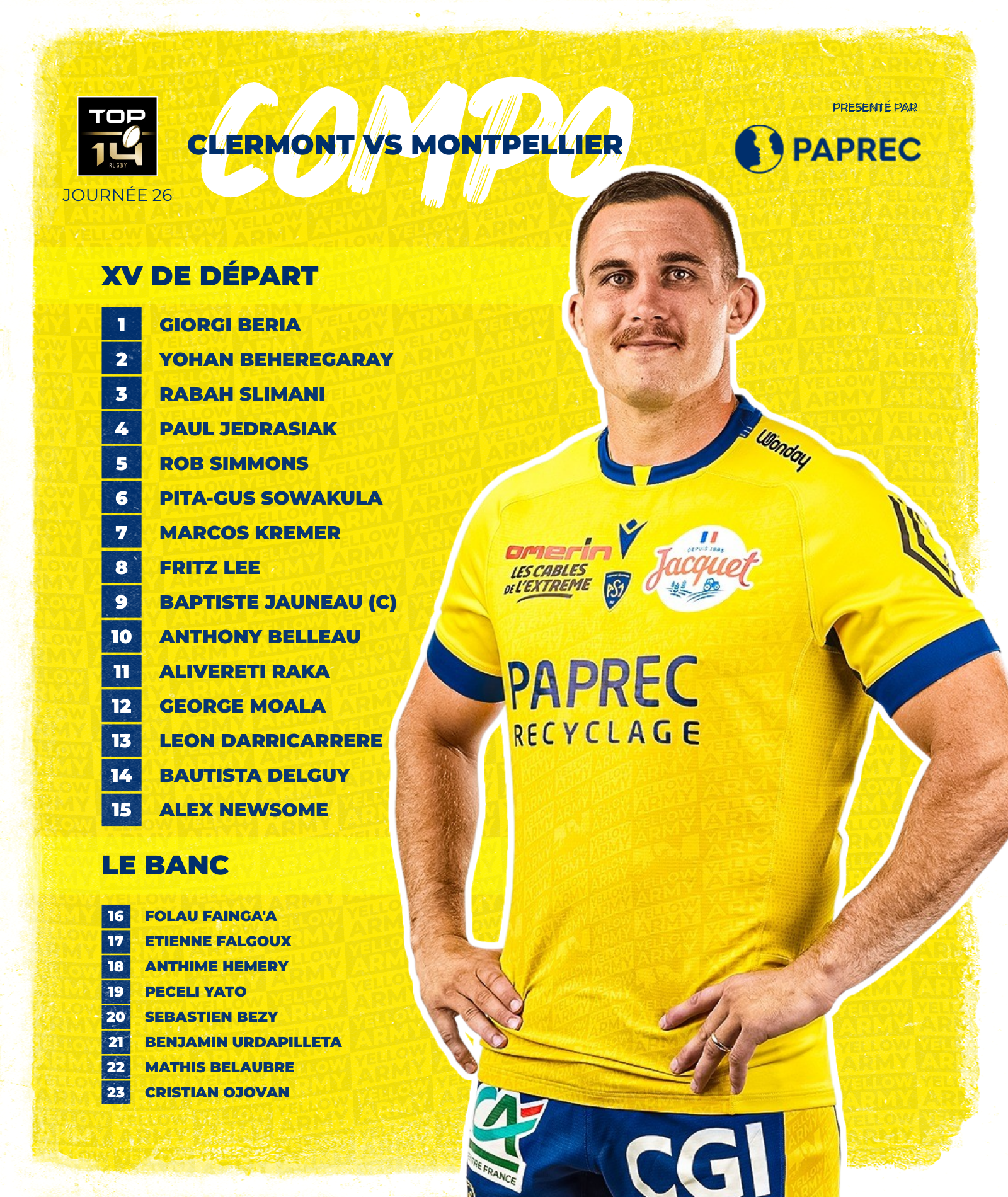 Les Auvergnats viseront le Top 8 avec une équipe assez proche de celle qui a disputé les dernières journées de championnat. Yohan Beheregaray et Paul Jedrasiak intègrent le cinq de devant pour leur dernière en Jaune et Bleu. Baptiste Jauneau et Anthony Belleau sont titularisés à la charnière et animeront le jeu clermontois.