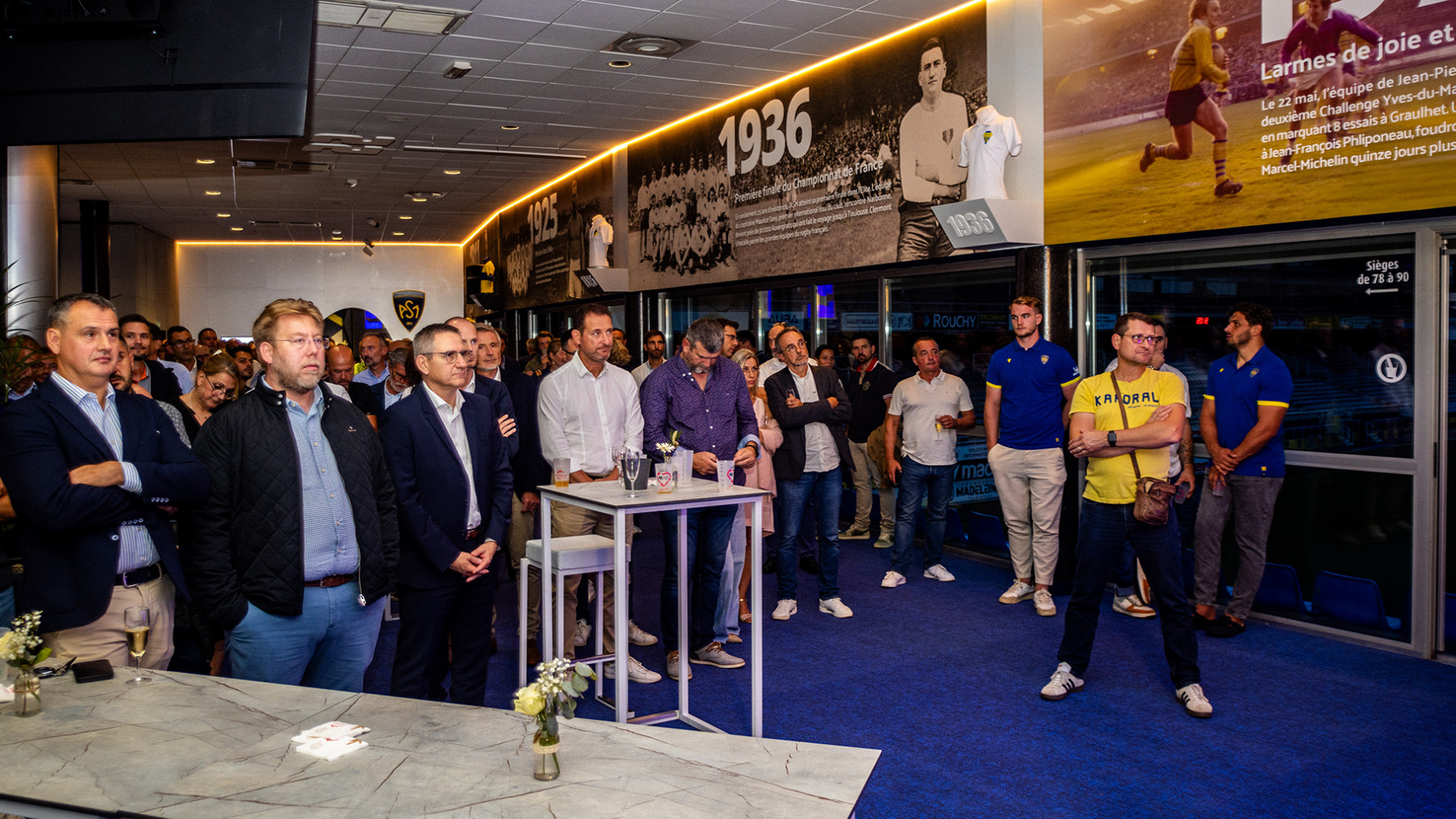 Totalement rénové, le nouvel espace Groupama Rugby Club est un fil conducteur entre tradition et modernité. Sur la frise monumentale qui surplombe la vue dominante sur la pelouse du Michelin, le club raconte son histoire plus que centenaire de 1911 à nos jours de Marcel-Michelin au titre de Filles de Romagnat en passant par les Brennus de 2010 et 2017, le tout dans une teinte bleu acier et quelques incrustations grises rappelant le béton fondateur du stade. Plus convivial et chaleureux, l’espace orné de nombreux détails sur l’histoire des Jaune et Bleu et les émotions qu’ils font vivre aux supporters sera l’une des places fortes du réceptif auvergnat.