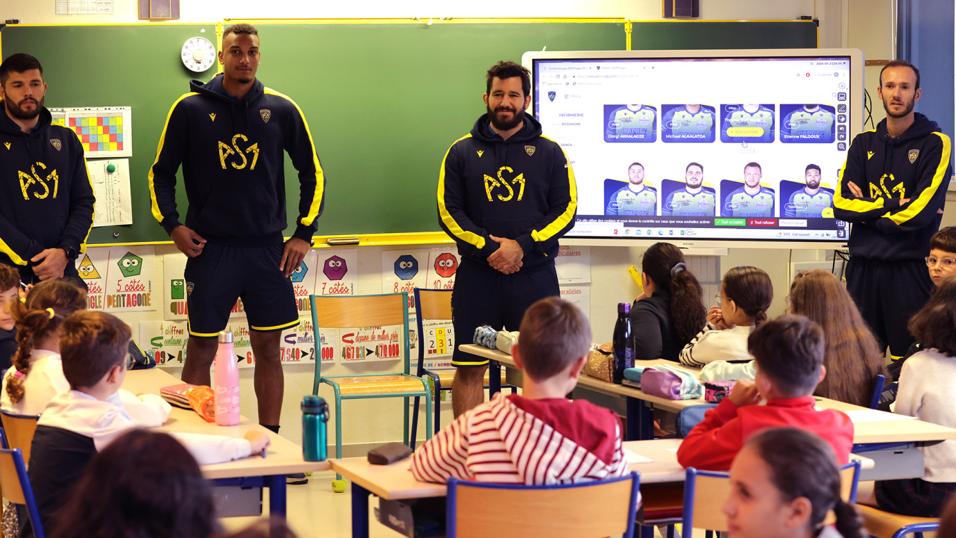 Sac à dos et stylos neufs, les Jaune et Bleu reprenaient ce matin le chemin de l’école à Cébazat avec les CM1 de l’établissement Ste-Cécile du centre-ville. Accueillis chaleureusement par les écoliers, les joueurs clermontois ont présenté leur parcours sur l’estrade avant de répondre aux nombreuses questions préparées par leurs hôtes. Des blessures, au planning de la semaine en passant par leurs meilleurs moments, leurs angoisses, ce qu’ils ont dans l’assiette, les joueurs clermontois se sont livrés en toute transparence et authenticité sur leur vie de rugbymen. Ils ont notamment appris le passé de boxeur de Sam M’Foudi celui de skieur d’Etienne Falgoux et découvert que Joris Jurand était fan de Jul et de l’OM… Aucun sujet n’a été éludé puisque les joueurs auvergnats ont insisté sur la chance qu’ils avaient de vivre de leur passion et de l’importance de suivre un cursus scolaire en parallèle de celle-ci afin de préparer l’avenir, conscients que les carrières de sportifs sont éphémères et qu’il y a bien plus d’appelés que d’élus. Questionné sur le dopage par les enfants, Etienne en a profité pour faire passer un message fort « Quel intérêt de faire du sport de haut-niveau pour tricher ? Ce n’est que se mentir à soi-même... » Des paroles sincères qui ont touché les élèves de Cébazat ravis de cette matinée qui s’est terminée par une séance dédicaces et une photo de classe dont ils se souviendront longtemps.