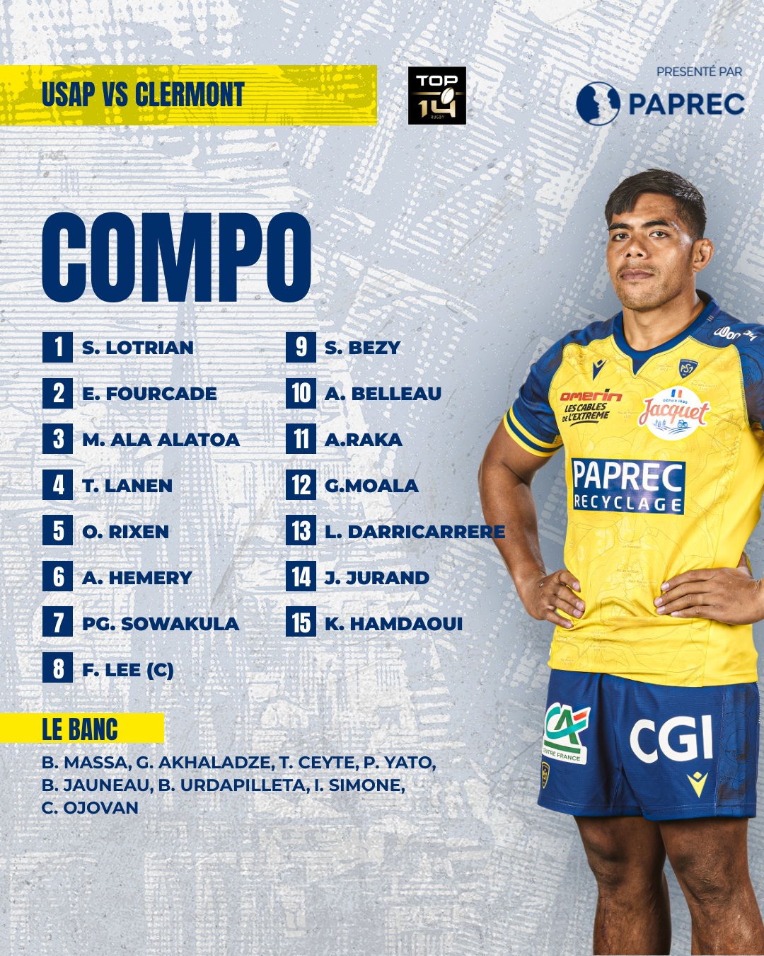 9 changements interviennent pour le déplacement des Jaune et Bleu en Catalogne. Il y aura du nouveau dans toutes les lignes et aussi sur le banc pour cette quatrième journée de Top14. A commencer par la première ligne entièrement renouvelée où le local de l’étape, Sacha Lotrian, retrouve l’axe gauche de la mêlée. Etienne Fourcade débutera au talonnage et accompagnera l’international Samoan Michael Ala’alatoa pour sa première en Top 14. Derrière Oskar Rixen se voit offrir la première opportunité de s’exprimer avec le maillot clermontois. Il formera l’attelage avec Thibaud Lanen. Ce sera plus classique en troisième ligne où Fritz Lee (capitaine) et Pita-Gus Sowakula accueillent Anthime Hemery (2ème titularisation avec l’ASM après le déplacement à Bordeaux la saison dernière).