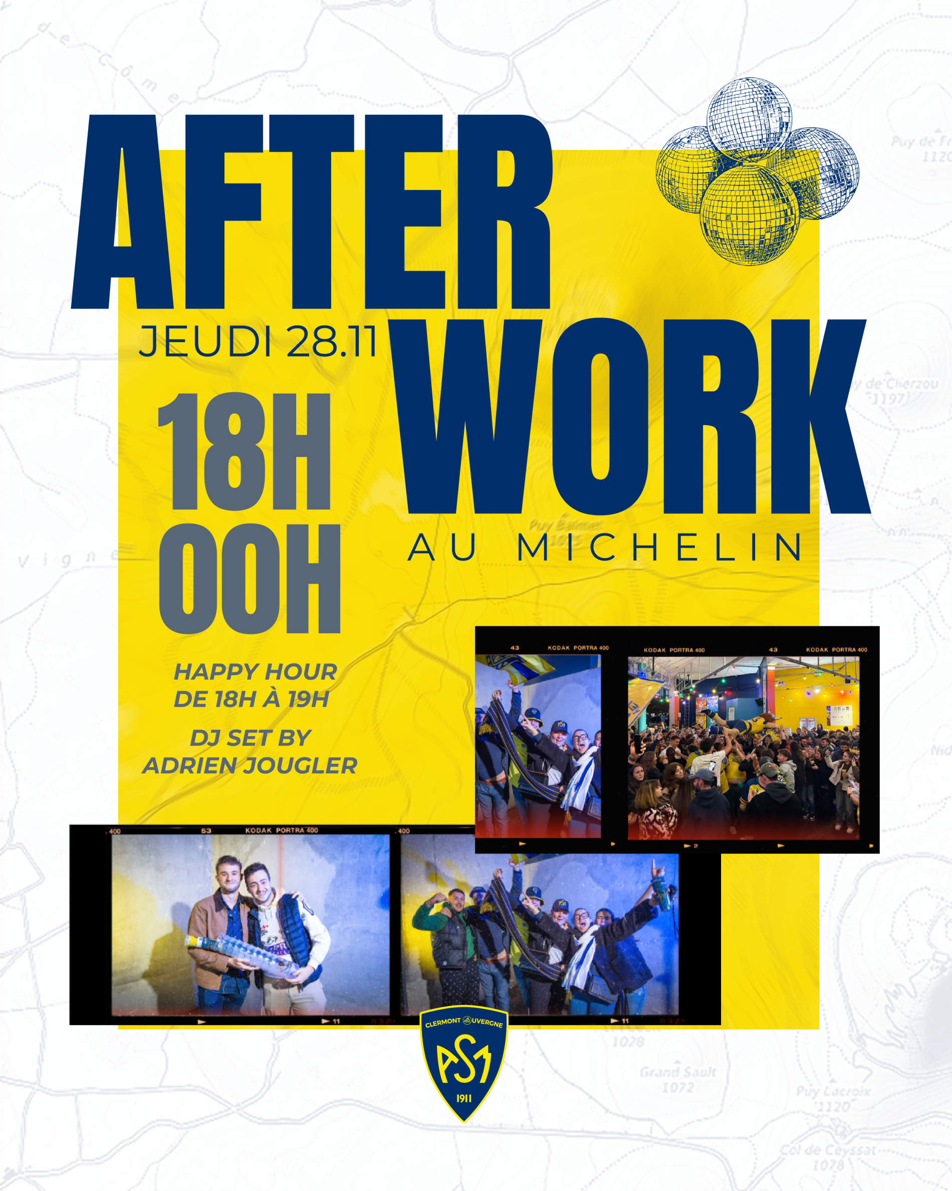 Quelques jours avant la réception du Castres Olympique, le club auvergnat va ouvrir ses portes aux supporters pour le premier AFTERWORK du Michelin. Ainsi le jeudi 28 novembre de 18 heures à minuit l’ambiance promet d’être conviviale et festive au bar Gallia le 22 où se déroulera ce premier Afterwork en Jaune et Bleu.