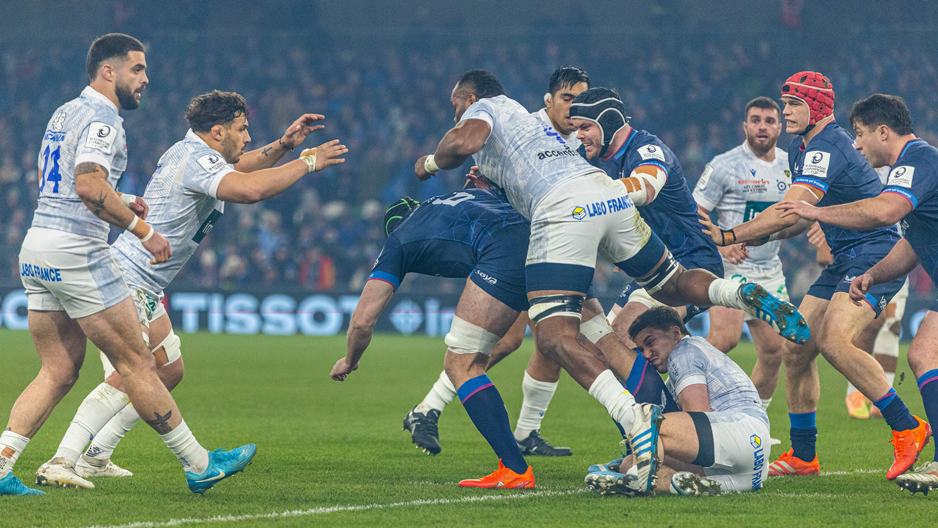 Christophe Urios l’a confié en salle de Presse, l’ASM avait préparé ce match pour le remporter et pas seulement pour subir les assauts du Leinster. Sans complexe ce sont d’ailleurs les Auvergnats qui imposent leur loi en pilonnant les Irlandais sur les premiers temps de jeu et dès la cinquième minute après un premier ballon volé par l’alignement clermontois, Alivereti Raka termine l’action en sautant au milieu d’un ruck pour un premier essai spectaculaire. Pris à la gorge, le Leinster bafouille son rugby et ne parvient pas à sortir de l’emprise défensive des Jaune et Bleui menés par une troisième ligne qui découpe tout sur son passage. Dominés dans le jeu aérien et l’occupation du terrain, les cartes sont redistribuées à la 20ème minute lorsque les Auvergnats perdent simultanément leurs deux centres (Moala et Fouyssac). Benjamin Urdapilleta rééquilibre l’occupation du terrain alors qu’Irae apporte de la densité dans le centre du terrain. Il faudra quelques minutes pour s’adapter. Le Leinster en profite pour dérouler une action aux multiples temps de jeu qui envoie Ringrose dans l’en-but. Le match prend un tournant improbable sur l’action suivante, puisque les Clermontois récupèrent un nouveau ballon et vont jusque dans l’en-but du Leinster où ils échappent le ballon, une terrible contre-attaque de 100 m et deux temps de jeu assomme l’ASM au moment où Jordie Barrett inscrit le deuxième essai irlandais. Clermont aurait pu plier mais va au contraire résister.