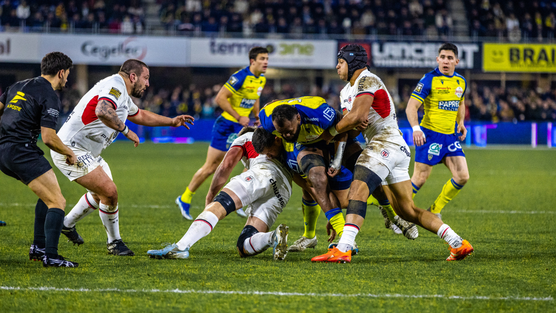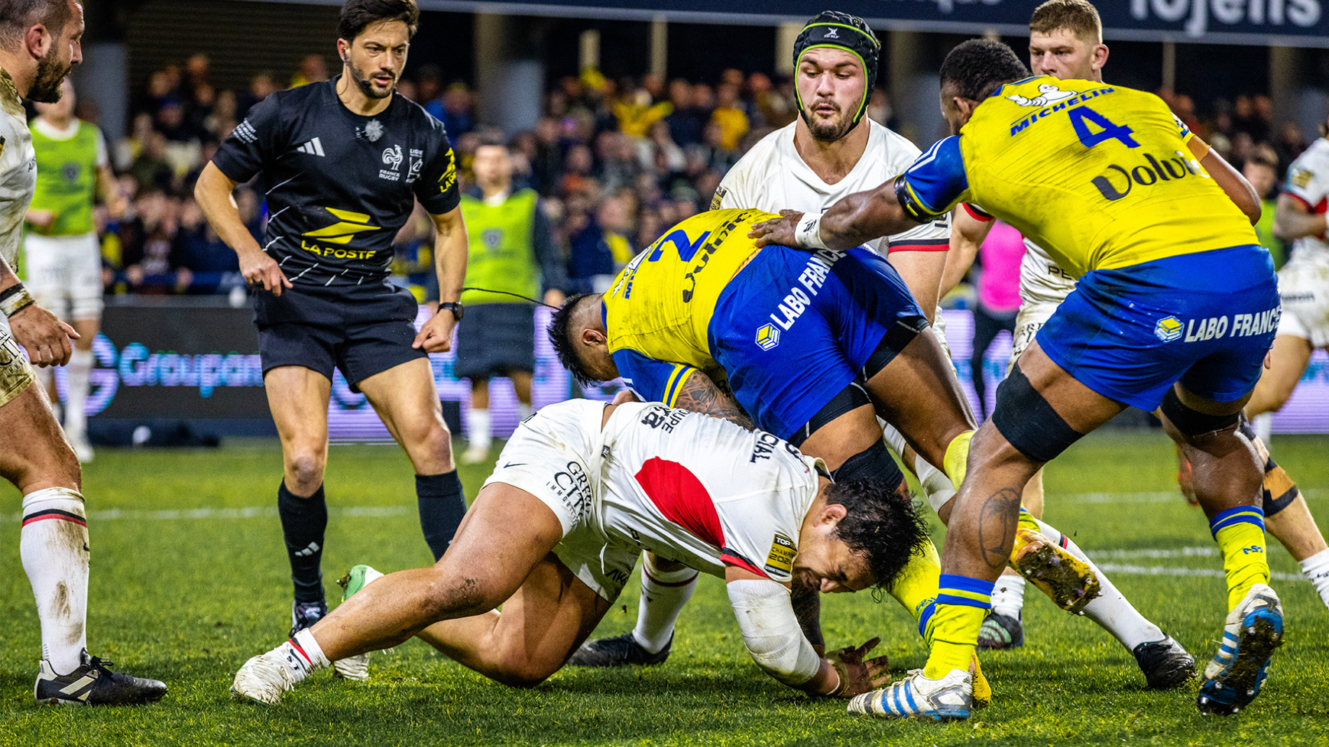 Christophe Urios avait prévenu : « la défense toulousaine sans les internationaux est la meilleure de France ». Les prédictions du coach clermontois se sont vérifiées tout au long du premier acte où les Auvergnats se sont cassés les dents (et aussi de nombreux joueurs) sur le mur rouge et noir étalé sur une ligne de 14 joueurs. Intransigeants sur la ligne d’affrontement les Champions de France en titre ont dans un premier temps contenu les offensives clermontoises sans chercher à tenir le ballon. Efficaces, ils ont toutefois pris la tête de la rencontre sur une pénalité de Delpy (8e). Raka aurait pu décanter cette rencontre mais l’ailier clermontois manque une occasion dans la foulée et, est, quelques minutes plus tard, à l’origine d’un premier tournant de la rencontre en quittant ses partenaires sur un plaquage haut suivi d’un carton (et d’une commotion…) En supériorité numérique, il ne faut qu’une attaque pour que Richie Arnold ne passe les bras pour Delibes qui file derrière la ligne pour la première fois de la soirée. Anthony Jelonch profite, lui, des dernières minutes de supériorité pour venir lancé plein champ après un bon travail de ses avants pour donner un écart conséquent aux Toulousains (3-17 à la 37e). Les Auvergnats ne baissent pas les bras et se rebiffent avant le retour aux vestiaires en enchainant les ballons portés près de la ligne adverse. Toulouse cède enfin et se retrouve à son tour en infériorité (Jelonch, carton jaune). Le Michelin se réveille…