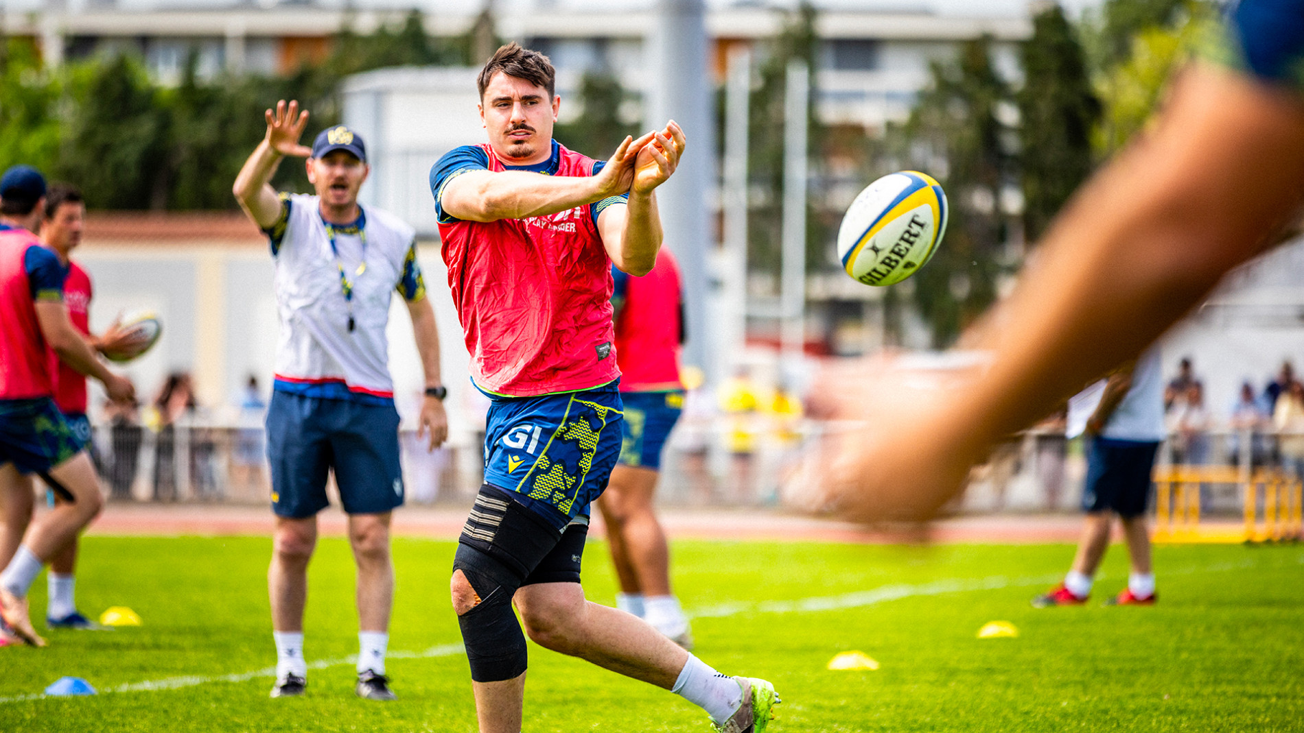 Lucas Dessaigne faisait figure de local de l’étape lui qui entraine (depuis 5 saisons) les joueurs du RC Riomois « c’est vrai que ça fait plaisir de s’entrainer, ici… il faut dire que les lieux sont plutôt familiers »… le monde en tribune également pour le troisième ligne clermontois, à nouveau opérationnel et en quête d’une opportunité lors de cette fin de saison. « Ils sont même encore plus nombreux le dimanche » rigole Lucas. Pour la plaisanterie, on s’arrêtera là après une séance très intense en ce lendemain de fête du travail. Du boulot, il y en a eu cet après-midi devant les supporters auvergnats qui ont profité de la proximité souhaité par le coach des Jaune et Bleu pour créer un engouement autour de cette fin de saison. Les supporters ont ainsi pu se rendre compte du niveau d’intensité et de l’exigence des Clermontois qui ont enchainé les actions à un rythme effréné, le tout sous un soleil plus que printanier.