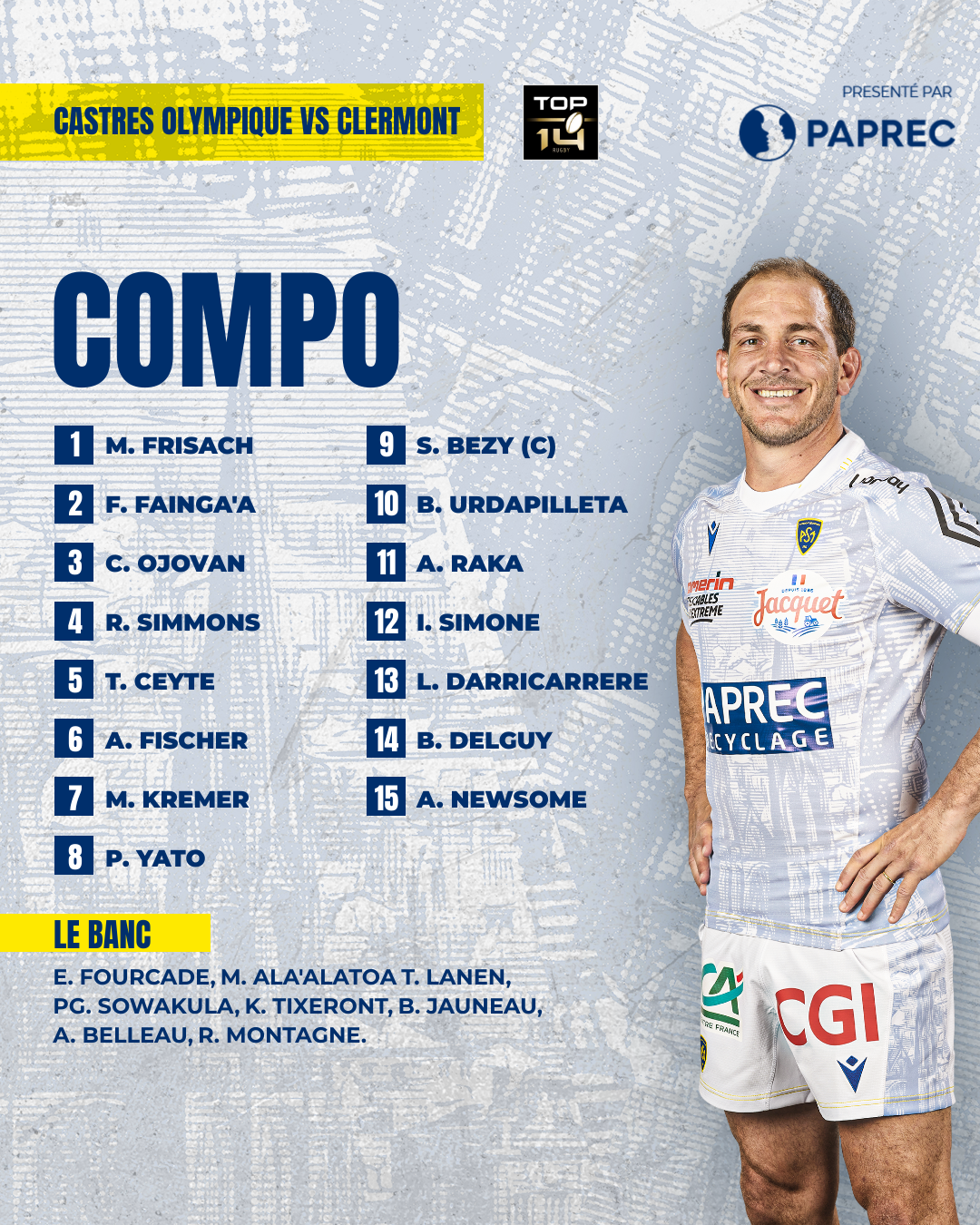 Derrière Sébastien Bézy et Baptiste Jauneau poursuivent leurs rotations. Sébastien évoluera sur la pelouse castraise en compagnie de Benjamin Urdapilleta qui retrouvera une pelouse qu’il connait bien à quelques semaines de la fin de sa carrière. Un moment fort comme les aime l’ouvreur argentin. Sur le banc, les Auvergnats vont pouvoir compter sur le retour d’Anthony Belleau, remis de son souci aux ischio-jambiers. Dans la ligne d’attaque, hormis le forfait de George Moala, secoué face à l’USAP et remplacé par Irae Simone, auteur d’une entrée remarquée face aux Catalans aucun changement puisque nous retrouvons Léon Darricarrère, Alivereti Raka, Bautista Delguy et Alex Newsome.