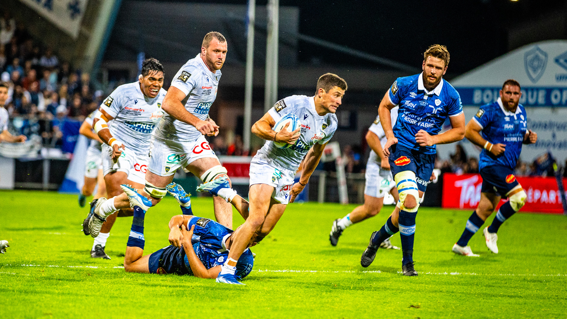 Les Auvergnats s’attendaient à une entame très solide des Castrais surmotivés à l’idée de retrouver leur stade et leur public après le drame qu’ils ont vécu. Dominateurs sur la ligne d’avantage le CO n’a mis que 6 minutes pour marquer son territoire (essai de Palis après une première attaque tranchante). Clermont parvient à rester dans la bataille grâce à un joli côté fermé bien exploité par Newsome qui décale pour Fischer qui solidement file derrière la ligne. Clermont va même prendre l’avantage grâce à une pénalité de Benjamin Urdapilleta (7-8 à la 19ème), mais c’est bien le CO qui gagne les contacts et avance dans le terrain profitant des erreurs défensives clermontoises (une quinzaine de plaquages manqués à la pause). Dans le sillage de Papali’i et de l’agressivité défensive de Babillot et Delaporte, les Castrais impriment le rythme de cette rencontre et trouvent des solutions dans le jeu de mouvement. Le Bun aplatit à la 24e et 4 minutes plus tard il est imité par Gaetan Barlot qui conduit un ballon porté derrière la ligne d’en-but auvergnate. Clermont subit et l’ouvreur tarnais rajoute 3 points supplémentaires qui concrétisent la domination du CO lors de cette première période.