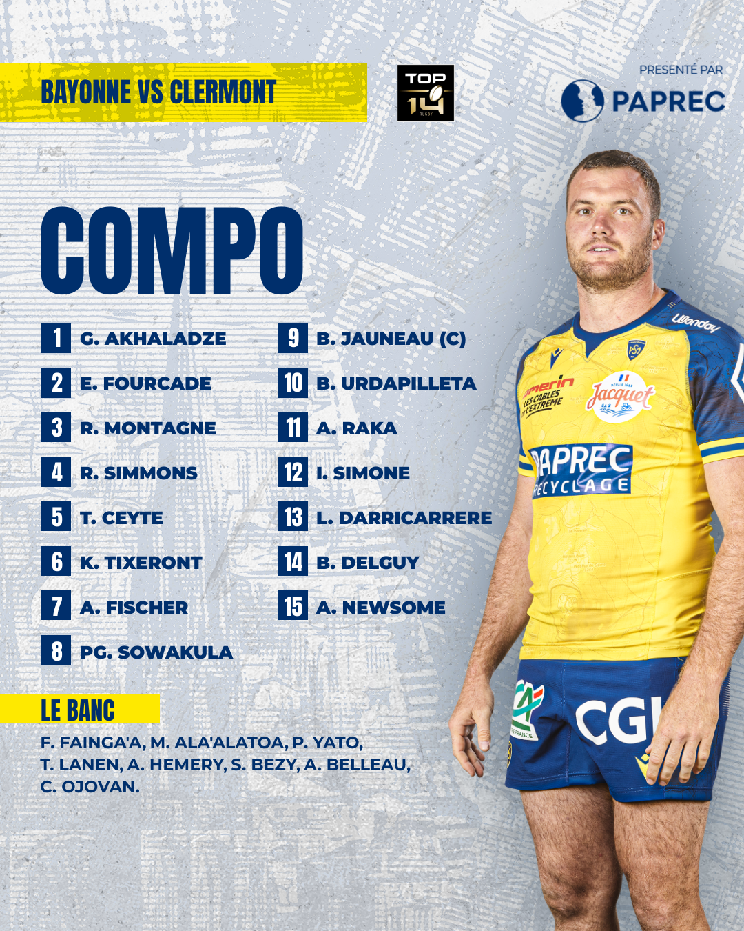 Christophe Urios a décidé de jouer la continuité en alignant le XV de départ victorieux à Montpellier pour disputer ce barrage face à l’Aviron Bayonnais. Un seul changement intervient dans le groupe puisque Michael Ala’Alatoa remplace Mathéo Frisach, légèrement touché à un adducteur dans l’Hérault.