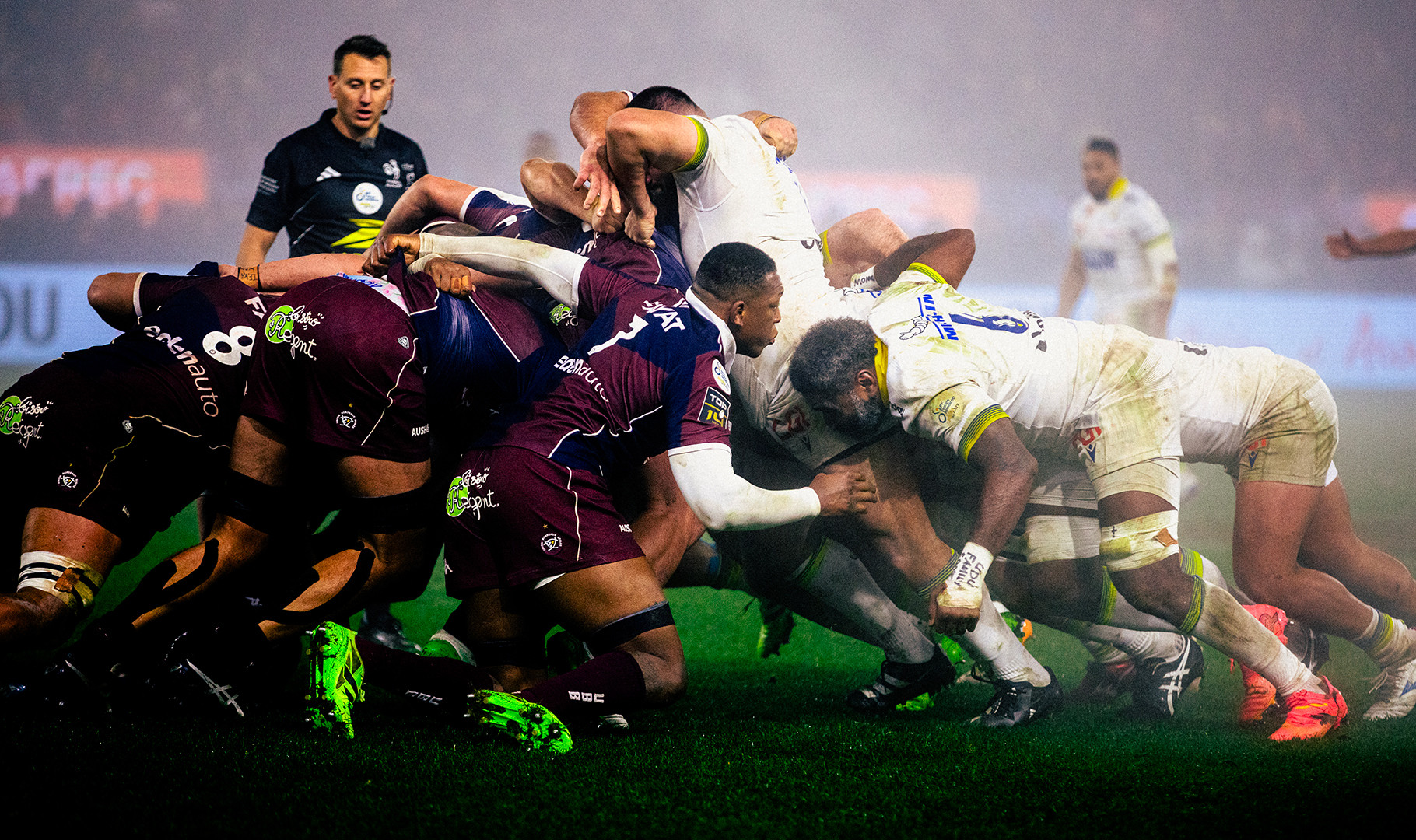 Les Clermontois avaient besoin de chasser les doutes après une semaine aussi courte que tendue. Dans des conditions particulièrement difficiles (brouillard, froid et ballon glissant), les zones de collision se sont vite imposées comme les lieux de décision de ce match où Bordeaux n’a jamais vraiment trouvé de solution face à une défense clermontoise menée par un Marcos Kremer des grands jours. Redoutable sur la ligne d’avantage le flanker argentin n’a pas laissé le moindre centimètre à ses adversaires pendant qu’Harry Plummer alternait à merveille entre prises d’initiative et jeu au pied. Après 10 grosses minutes de bras de fer, ce sont les Auvergnats qui prennent les devants dans le sillage d’une mêlée conquérante et de mauls retrouvés. C’est dans ce domaine que le premier tournant de la rencontre intervient. Après une touche bien captée, la machine se met en marche et roule sur l’UBB. Monsieur Bralley file sous les poteaux pour un essai de pénalité assorti d’une expulsion temporaire. L’ASM est dans un gros temps fort et sur le renvoi après une grosse percée de Thomas Ceyte, les clermontois déboulent dans le bon timing et George Moala dans son style de déménageur franchit la ligne d’en-but pour la deuxième fois de la soirée. On n’y voit pas grand-chose sur la pelouse du Michelin mais on devine l’âpreté du combat. Comme toujours, Bautista Delguy met une terrible pression dans les duels aériens et gagne de précieux ballons dans le ciel bien couvert du Michelin. Les Bordelais, bien contenus par les défenseurs auvergnats vont tout de même bonifier une pénaltouche avec un pick and go de Gaëtan Barlot qui file derrière la ligne d’essai. Bordeaux revient mais Jefferson Poirot continue de vivre une soirée difficile en mêlée et offre une nouvelle occasion à Harry Plummer de corser la note. A la pause, l’ASM vire avec 13 points d’avance et de belles dispositions.