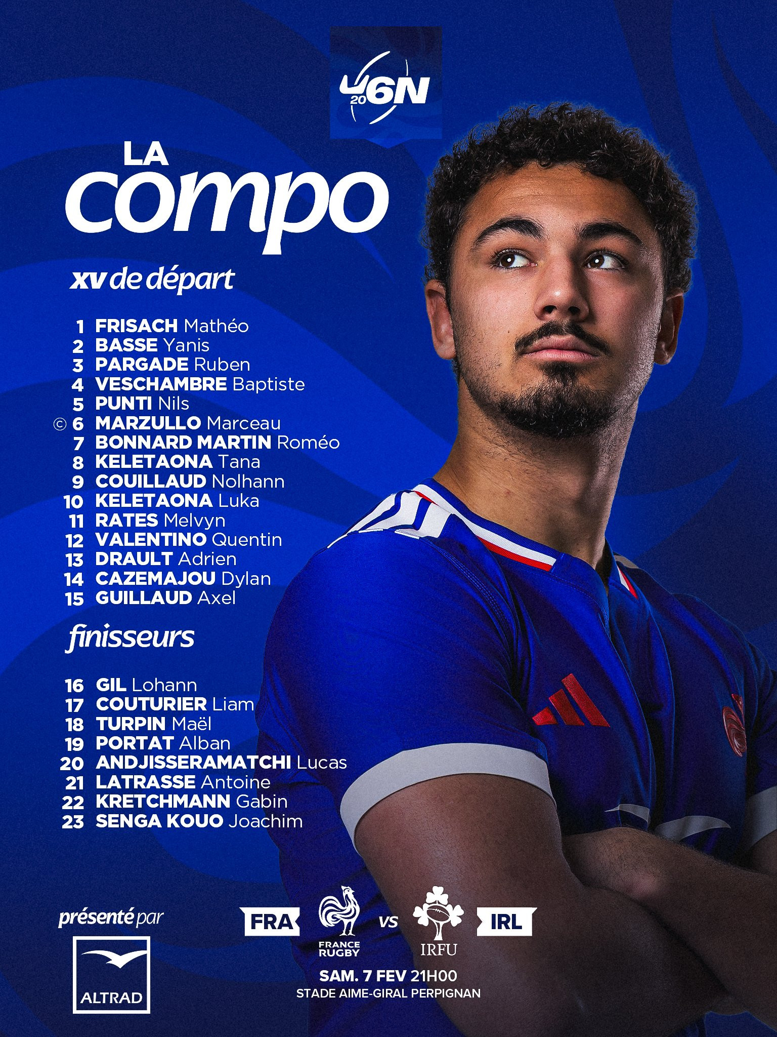 Les 3 Clermontois expérimentés et intégrés depuis le début de la saison (ou déjà la précédente pour Mathéo Frisach) au groupe professionnel des Jaune et Bleu formeront l’ossature et la plus grosse délégation du XV U20 tricolore. Avec 11 feuilles de match (en Top 14 et en Coupe d’Europe) Mathéo Frisach, le jeune gaucher des Jaune et Bleu, sera même le joueur le plus expérimenté des Bleuets suivi de près par le talonneur du Racing, Yanis Basse (10 apparitions avec les Pros) et son coéquipier Axel Guillaud (8 feuilles de match cette saison). L’arrière Clermontois, révélation de ce début d’année sera positionné à l’arrière alors que Baptiste Veschambre (18 ans, surclassé) débutera lui en seconde ligne. Un poste où les Auvergnats ont encore en réserve Rémy Lanen et Léo Michaux qui devraient également intégrer le Tournoi dans les prochaines semaines.